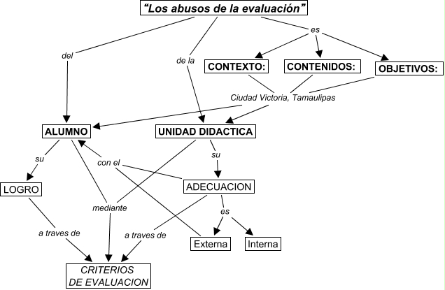 Este Cmap, tiene información relacionada con: EVALUACION, CONTENIDOS: Ciudad Victoria, Tamaulipas ALUMNO, “Los abusos de la evaluación” es CONTENIDOS:, “Los abusos de la evaluación” de la UNIDAD DIDACTICA, ALUMNO su LOGRO, CONTEXTO: Ciudad Victoria, Tamaulipas ALUMNO, UNIDAD DIDACTICA su ADECUACION, LOGRO a traves de CRITERIOS DE EVALUACION, CONTEXTO: Ciudad Victoria, Tamaulipas UNIDAD DIDACTICA, OBJETIVOS: Ciudad Victoria, Tamaulipas ALUMNO, CONTENIDOS: Ciudad Victoria, Tamaulipas UNIDAD DIDACTICA, UNIDAD DIDACTICA mediante CRITERIOS DE EVALUACION, ADECUACION a traves de CRITERIOS DE EVALUACION, “Los abusos de la evaluación” es CONTEXTO:, Externa con el ALUMNO, ADECUACION con el ALUMNO, ADECUACION es Interna, ADECUACION es Externa, OBJETIVOS: Ciudad Victoria, Tamaulipas UNIDAD DIDACTICA, ALUMNO mediante CRITERIOS DE EVALUACION, “Los abusos de la evaluación” del ALUMNO