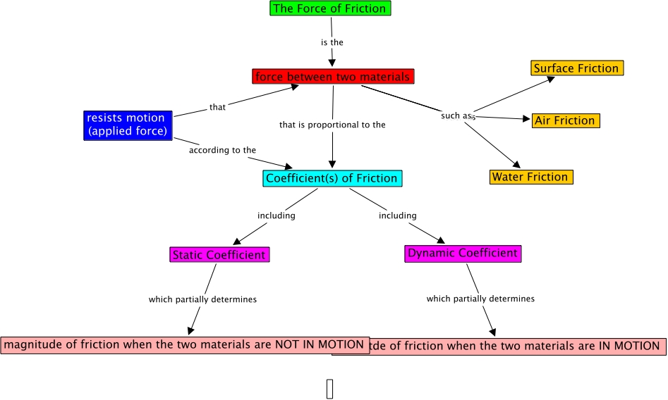 Friction by Helana, Coefficient(s) of Friction including Static Coefficient, Dynamic Coefficient which partially determines magnitde of friction when the two materials are IN MOTION, force between two materials such as Water Friction, Static Coefficient which partially determines magnitude of friction when the two materials are NOT IN MOTION, force between two materials that is proportional to the Coefficient(s) of Friction, The Force of Friction is the force between two materials, resists motion (applied force) according to the Coefficient(s) of Friction, Coefficient(s) of Friction including Dynamic Coefficient, force between two materials such as Air Friction, force between two materials such as Surface Friction
