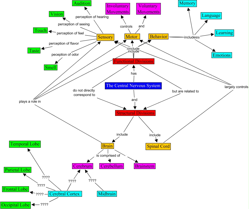 Esse mapa conceitual, produzido no IHMC CmapTools, tem a informação relacionada a: CNS by Helana, Behavior includes Language, Sensory perception of flavor Taste, Structural Divisions include Brain, Cerebral Cortex ???? Frontal Lobe, Cerebral Cortex ???? Parietal Lobe, Functional Divisions but are related to Structural Divisions, Sensory peception of odor Smell, Brain Cerebrum, The Central Nervous System and Structural Divisions, Spinal Cord largely controls Sensory, Behavior includes Memory, Brain plays a role in Behavior, Brain plays a role in Sensory, Functional Divisions include Sensory, Cerebral Cortex ???? Cerebrum, Brain Brainstem, Sensory perception of feel Touch, Behavior includes Learning, Sensory perception of hearing Audition, Cerebral Cortex ???? Occipital Lobe