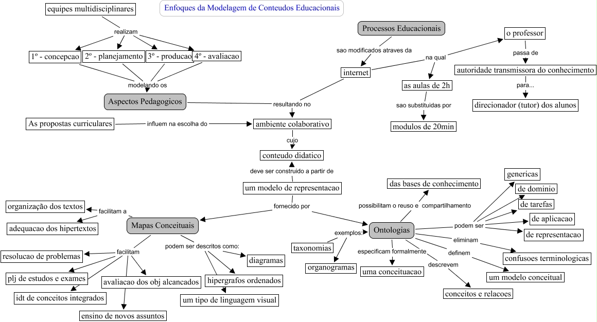 Esse mapa conceitual, produzido no IHMC CmapTools, tem a informação relacionada a: Hyperdocs, 3º - producao modelando os Aspectos Pedagogicos, internet resultando no ambiente colaborativo, equipes multidisciplinares realizam 2º - planejamento, Ontologias descrevem conceitos e relacoes, Mapas Conceituais facilitam resolucao de problemas, Ontologias especificam formalmente uma conceituacao, Mapas Conceituais podem ser descritos como: um tipo de linguagem visual, ambiente colaborativo cujo conteudo didatico, Mapas Conceituais facilitam plj de estudos e exames, Ontologias podem ser de tarefas, 1º - concepcao modelando os Aspectos Pedagogicos, internet na qual o professor, Ontologias podem ser de aplicacao, Ontologias podem ser genericas, equipes multidisciplinares realizam 1º - concepcao, taxonomias exemplos: organogramas, Ontologias possibilitam o reuso e compartilhamento das bases de conhecimento, 4º - avaliacao modelando os Aspectos Pedagogicos, Mapas Conceituais facilitam idt de conceitos integrados, As propostas curriculares influem na escolha do ambiente colaborativo