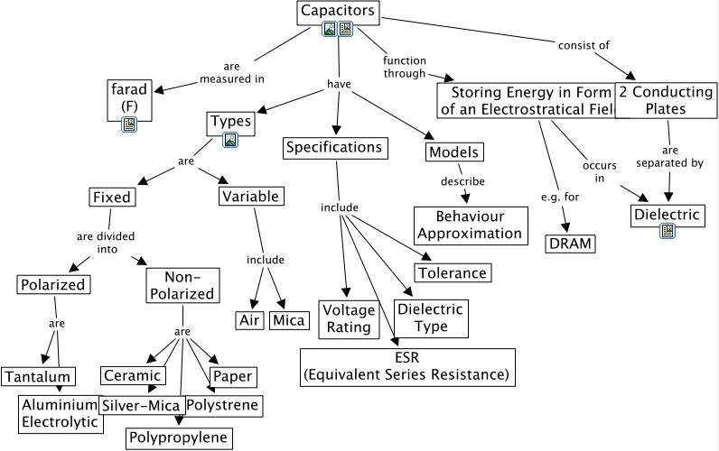 Capacitors, Specifications include Dielectric Type, Models describe Behaviour Approximation, Capacitors function through Storing Energy in Form of an Electrostratical Field, Non- Polarized are Polystrene, Types are Variable, Specifications include Voltage Rating, Polarized are Aluminium Electrolytic, Capacitors have Specifications, Non- Polarized are Paper, Storing Energy in Form of an Electrostratical Field e.g. for DRAM