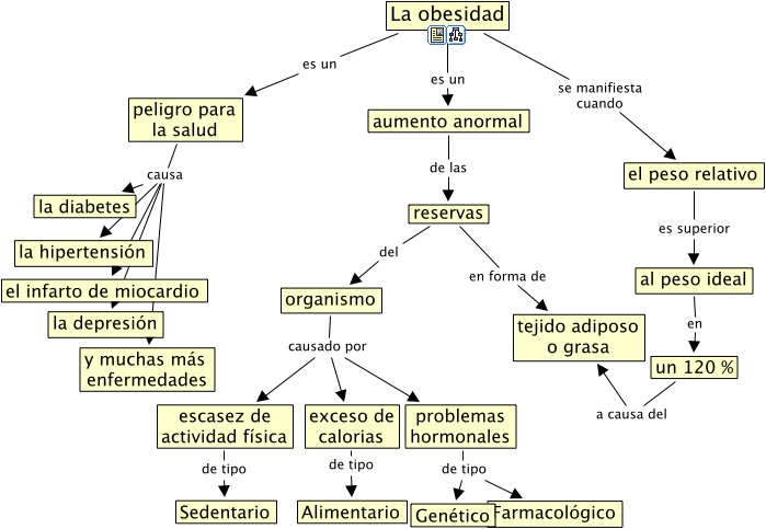 Obesidad, organismo causado por exceso de calorias, peligro para la salud causa la depresión, reservas en forma de tejido adiposo o grasa, organismo causado por escasez de actividad física, peligro para la salud causa la hipertensión, aumento anormal de las reservas, La obesidad es un peligro para la salud, peligro para la salud causa la diabetes, organismo causado por problemas hormonales, al peso ideal en un 120 %
