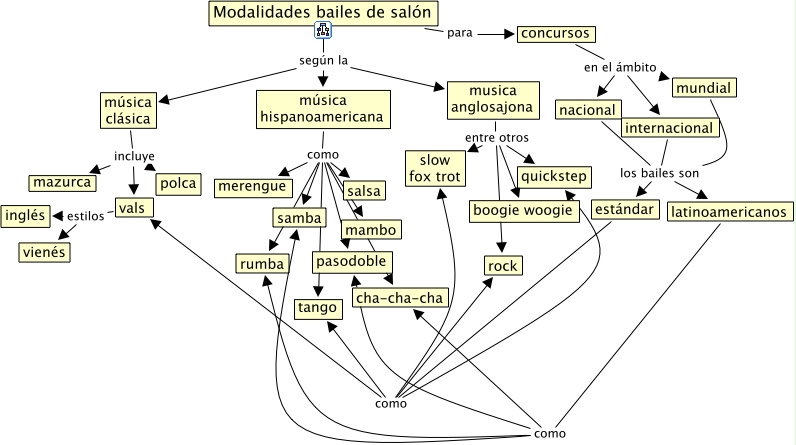 Modalidades baile de salon, estándar como tango, mundial los bailes son latinoamericanos, musica anglosajona entre otros rock, internacional los bailes son estándar, música hispanoamericana como pasodoble, estándar como vals, estándar como quickstep, concursos en el ámbito internacional, vals estilos inglés, concursos en el ámbito nacional