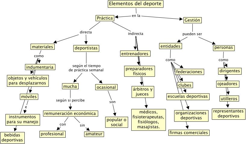 Deporte_Elementos, móviles e instrumentos para su manejo, Práctica indirecta médicos, fisioterapeutas, fisiólogos, masajistas., Práctica directa materiales, personas como ojeadores, Gestión pueden ser personas, Práctica indirecta árbitros y jueces, personas como representantes deportivos, Elementos del deporte en la Gestión, remuneración económica sin amateur, deportistas según el tiempo de práctica semanal ocasional