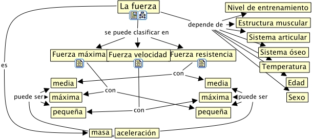 Fuerza clasificacion, masa puede ser pequeña, aceleración puede ser media, La fuerza se puede clasificar en Fuerza velocidad, La fuerza depende de Nivel de entrenamiento, La fuerza se puede clasificar en Fuerza máxima, aceleración puede ser pequeña, masa * aceleración, Fuerza resistencia con media, La fuerza se puede clasificar en Fuerza resistencia, aceleración puede ser máxima