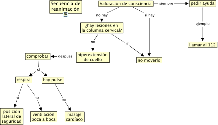 Primerios auxilios. Secuencia de reanimacion, hay pulso no masaje cardíaco, respira no ventilación boca a boca, Valoración de consciencia siempre pedir ayuda, Valoración de consciencia no hay ¿hay lesiones en la columna cervical?, comprobar si respira, respira sí posición lateral de seguridad, comprobar si hay pulso, hiperextensión de cuello después comprobar, Valoración de consciencia si hay no moverlo, ¿hay lesiones en la columna cervical? sí no moverlo