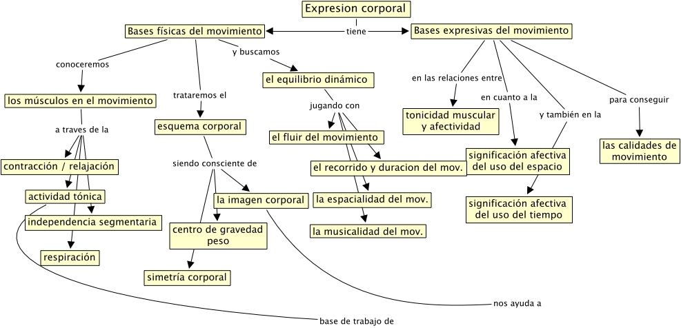 Elementos expresion, los músculos en el movimiento a traves de la respiración, Bases físicas del movimiento trataremos el esquema corporal, esquema corporal siendo consciente de centro de gravedad peso, Bases físicas del movimiento y buscamos el equilibrio dinámico, Expresion corporal tiene Bases físicas del movimiento, el equilibrio dinámico jugando con la espacialidad del mov., esquema corporal siendo consciente de la imagen corporal, Expresion corporal tiene Bases expresivas del movimiento, los músculos en el movimiento a traves de la actividad tónica, los músculos en el movimiento a traves de la independencia segmentaria