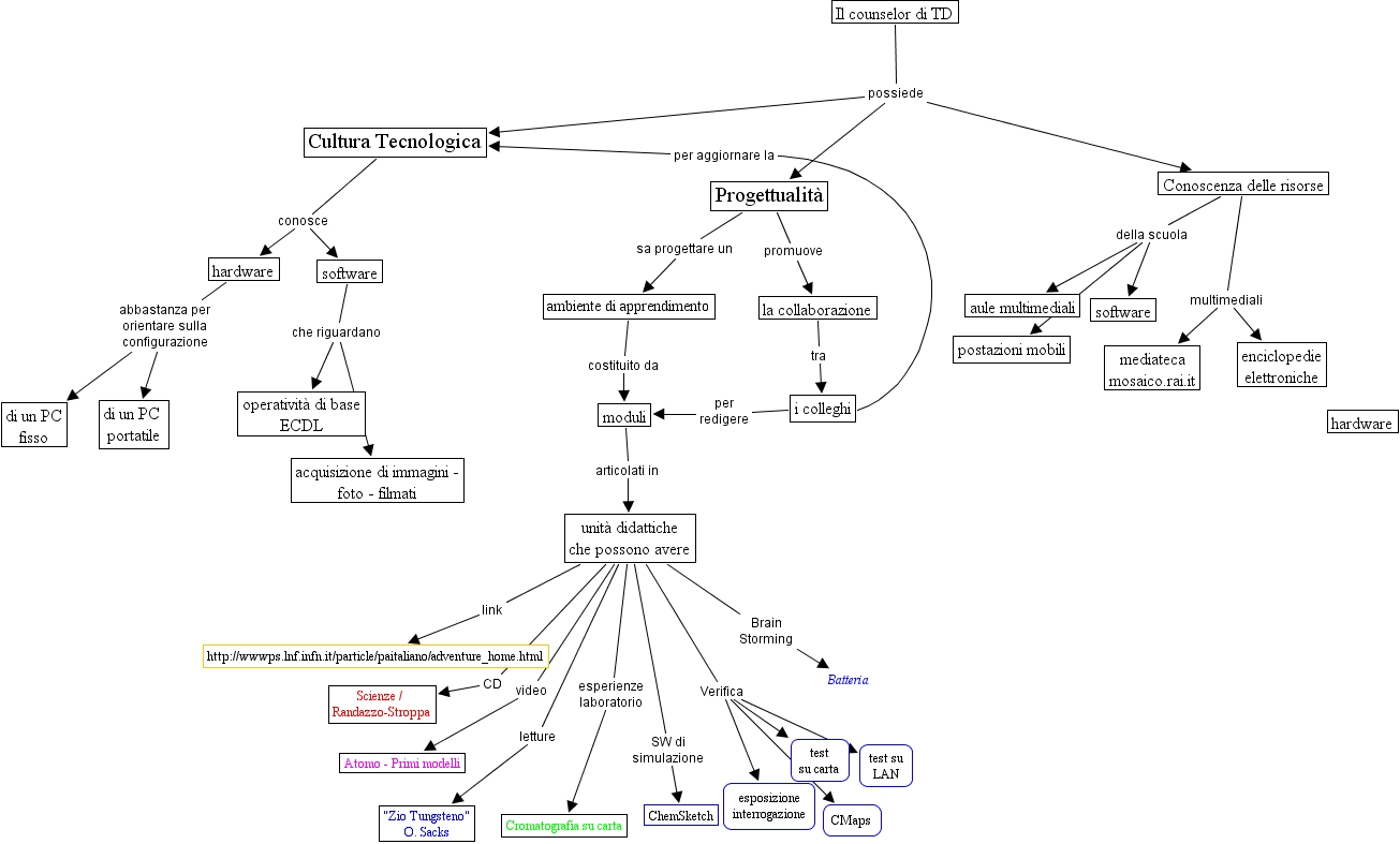 Il profilo del Consulente di TD, Conoscenza delle risorse multimediali mediateca mosaico.rai.it, Conoscenza delle risorse multimediali enciclopedie elettroniche, Conoscenza delle risorse della scuola software, Il counselor di TD possiede Conoscenza delle risorse, unità didattiche che possono avere link http://wwwps.lnf.infn.it/particle/paitaliano/adventure_home.html, ambiente di apprendimento costituito da moduli, Progettualità sa progettare un ambiente di apprendimento, software che riguardano acquisizione di immagini - foto - filmati, unità didattiche che possono avere SW di simulazione ChemSketch, unità didattiche che possono avere Verifica test su carta