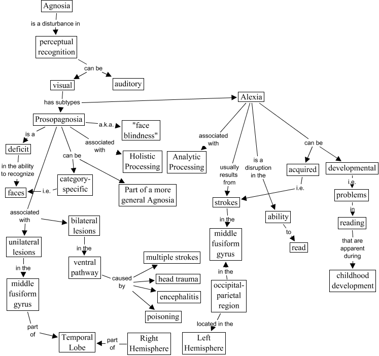 Este Cmap, tiene información relacionada con: Prosopagnosia, bilateral lesions in the ventral pathway, Prosopagnosia can be Part of a more general Agnosia, Alexia is a disruption in the ability, category- specific i.e. faces, Alexia associated with Analytic Processing, Prosopagnosia associated with unilateral lesions, Alexia can be developmental, Alexia can be acquired, deficit in the ability to recognize faces, Prosopagnosia associated with bilateral lesions, Alexia usually results from strokes, perceptual recognition can be visual, Right Hemisphere part of Temporal Lobe, visual has subtypes Alexia, Prosopagnosia associated with Holistic Processing, strokes in the middle fusiform gyrus, ventral pathway caused by multiple strokes, visual has subtypes Prosopagnosia, Prosopagnosia is a deficit, problems in reading