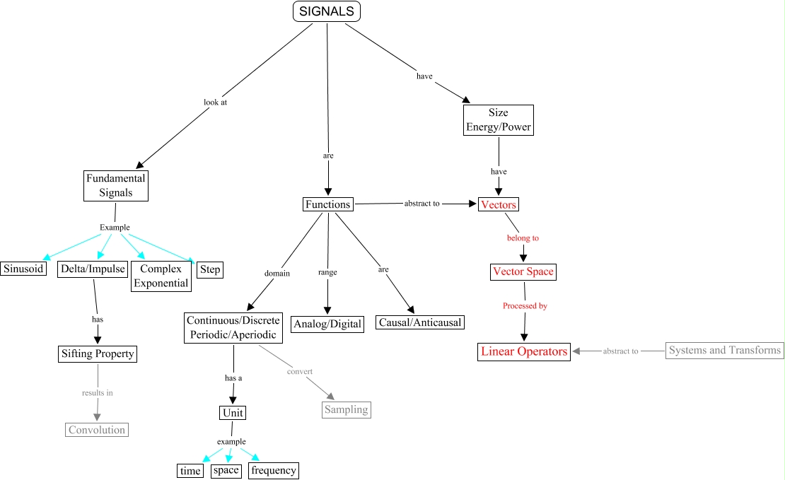 Este Cmap, tiene información relacionada con: Signals, Systems and Transforms abstract to Linear Operators, Delta/Impulse has Sifting Property, Sifting Property results in Convolution, Functions are Causal/Anticausal, Fundamental Signals Example Complex Exponential, SIGNALS are Functions, Continuous/Discrete Periodic/Aperiodic has a Unit, Functions abstract to Vectors, Vector Space Processed by Linear Operators, Size Energy/Power have Vectors, Functions domain Continuous/Discrete Periodic/Aperiodic, Vectors belong to Vector Space, SIGNALS look at Fundamental Signals, SIGNALS have Size Energy/Power, Continuous/Discrete Periodic/Aperiodic convert Sampling, Fundamental Signals Example Sinusoid, Unit example time, Unit example space, Fundamental Signals Example Step, Fundamental Signals Example Delta/Impulse