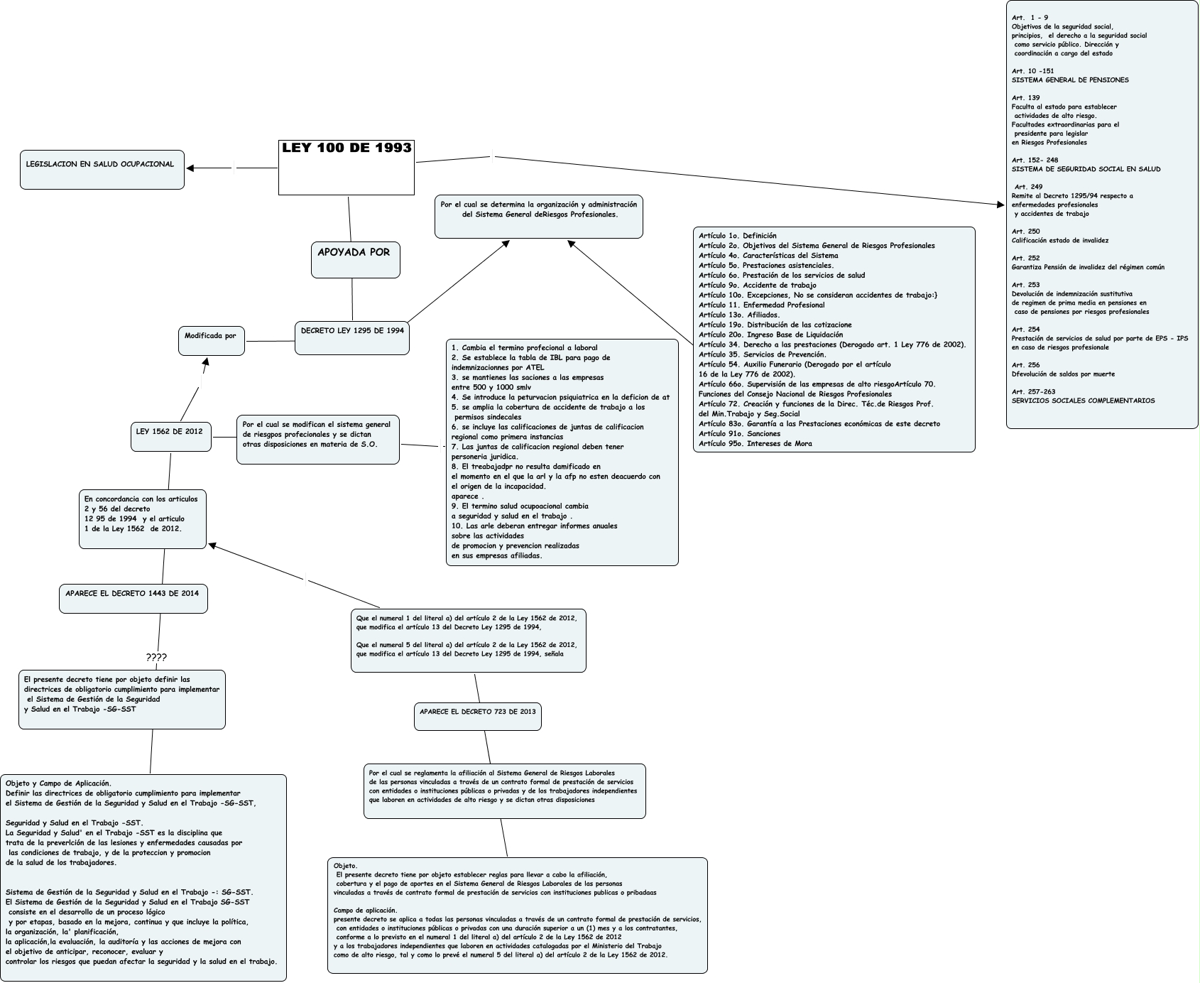 Este Cmap, tiene información relacionada con: Project-Solution_Diagram, Por el cual se modifican el sistema general de riesgpos profecionales y se dictan otras disposiciones en materia de S.O. 1. Cambia el termino profecional a laboral 2. Se establece la tabla de IBL para pago de indemnizacionnes por ATEL 3. se mantienes las saciones a las empresas entre 500 y 1000 smlv 4. Se introduce la peturvacion psiquiatrica en la deficion de at 5. se amplia la cobertura de accidente de trabajo a los permisos sindecales 6. se incluye las calificaciones de juntas de calificacion regional como primera instancias 7. Las juntas de calificacion regional deben tener personeria juridica. 8. El treabajadpr no resulta damificado en el momento en el que la arl y la afp no esten deacuerdo con el origen de la incapacidad. aparece . 9. El termino salud ocupoacional cambia a seguridad y salud en el trabajo . 10. Las arle deberan entregar informes anuales sobre las actividades de promocion y prevencion realizadas en sus empresas afiliadas., Artículo 1o. Definición Artículo 2o. Objetivos del Sistema General de Riesgos Profesionales Artículo 4o. Características del Sistema Artículo 5o. Prestaciones asistenciales. Artículo 6o. Prestación de los servicios de salud Artículo 9o. Accidente de trabajo Artículo 10o. Excepciones, No se consideran accidentes de trabajo:} Artículo 11. Enfermedad Profesional Artículo 13o. Afiliados. Artículo 19o. Distribución de las cotizacione Artículo 20o. Ingreso Base de Liquidación Artículo 34. Derecho a las prestaciones (Derogado art. 1 Ley 776 de 2002). Artículo 35. Servicios de Prevención. Artículo 54. Auxilio Funerario (Derogado por el artículo 16 de la Ley 776 de 2002). Artículo 66o. Supervisión de las empresas de alto riesgoArtículo 70. Funciones del Consejo Nacional de Riesgos Profesionales Artículo 72. Creación y funciones de la Direc. Téc.de Riesgos Prof. del Min.Trabajo y Seg.Social Artículo 83o. Garantía a las Prestaciones económicas de este decreto Artículo 91o. Sanciones Artículo 95o. Intereses de Mora ???? Por el cual se determina la organización y administración del Sistema General deRiesgos Profesionales., LEY 100 DE 1993 ???? DECRETO LEY 1295 DE 1994, LEY 1562 DE 2012 Modificada por, Que el numeral 1 del literal a) del artículo 2 de la Ley 1562 de 2012, que modifica el artículo 13 del Decreto Ley 1295 de 1994, Que el numeral 5 del literal a) del artículo 2 de la Ley 1562 de 2012, que modifica el artículo 13 del Decreto Ley 1295 de 1994, señala En concordancia con los articulos 2 y 56 del decreto 12 95 de 1994 y el articulo 1 de la Ley 1562 de 2012., LEY 1562 DE 2012 Por el cual se modifican el sistema general de riesgpos profecionales y se dictan otras disposiciones en materia de S.O., Modificada por ???? Por el cual se determina la organización y administración del Sistema General deRiesgos Profesionales., LEY 100 DE 1993 Art. 1 - 9 Objetivos de la seguridad social, principios, el derecho a la seguridad social como servicio público. Dirección y coordinación a cargo del estado Art. 10 -151 SISTEMA GENERAL DE PENSIONES Art. 139 Faculta al estado para establecer actividades de alto riesgo. Facultades extraordinarias para el presidente para legislar en Riesgos Profesionales Art. 152- 248 SISTEMA DE SEGURIDAD SOCIAL EN SALUD Art. 249 Remite al Decreto 1295/94 respecto a enfermedades profesionales y accidentes de trabajo Art. 250 Calificación estado de invalidez Art. 252 Garantiza Pensión de invalidez del régimen común Art. 253 Devolución de indemnización sustitutiva de regimen de prima media en pensiones en caso de pensiones por riesgos profesionales Art. 254 Prestación de servicios de salud por parte de EPS - IPS en caso de riesgos profesionale Art. 256 Dfevolución de saldos por muerte Art. 257-263 SERVICIOS SOCIALES COMPLEMENTARIOS, Que el numeral 1 del literal a) del artículo 2 de la Ley 1562 de 2012, que modifica el artículo 13 del Decreto Ley 1295 de 1994, Que el numeral 5 del literal a) del artículo 2 de la Ley 1562 de 2012, que modifica el artículo 13 del Decreto Ley 1295 de 1994, señala ???? Objeto. El presente decreto tiene por objeto establecer reglas para llevar a cabo la afiliación, cobertura y el pago de aportes en el Sistema General de Riesgos Laborales de las personas vinculadas a través de contrato formal de prestación de servicios con instituciones publicas o pribadaas Campo de aplicación. presente decreto se aplica a todas las personas vinculadas a través de un contrato formal de prestación de servicios, con entidades o instituciones públicas o privadas con una duración superior a un (1) mes y a los contratantes, conforme a lo previsto en el numeral 1 del literal a) del artículo 2 de la Ley 1562 de 2012 y a los trabajadores independientes que laboren en actividades catalogadas por el Ministerio del Trabajo como de alto riesgo, tal y como lo prevé el numeral 5 del literal a) del artículo 2 de la Ley 1562 de 2012., LEY 1562 DE 2012 ???? Objeto y Campo de Aplicación. Definir las directrices de obligatorio cumplimiento para implementar el Sistema de Gestión de la Seguridad y Salud en el Trabajo -SG-SST, Seguridad y Salud en el Trabajo -SST. La Seguridad y Salud' en el Trabajo -SST es la disciplina que trata de la preverlción de las lesiones y enfermedades causadas por las condiciones de trabajo, y de la proteccion y promocion de la salud de los trabajadores. Sistema de Gestión de la Seguridad y Salud en el Trabajo -: SG-SST. El Sistema de Gestión de la Seguridad y Salud en el Trabajo SG-SST consiste en el desarrollo de un proceso lógico y por etapas, basado en la mejora, continua y que incluye la política, la organización, la' planificación, la aplicación,la evaluación, la auditoría y las acciones de mejora con el objetivo de anticipar, reconocer, evaluar y controlar los riesgos que puedan afectar la seguridad y la salud en el trabajo., LEY 100 DE 1993 LEGISLACION EN SALUD OCUPACIONA