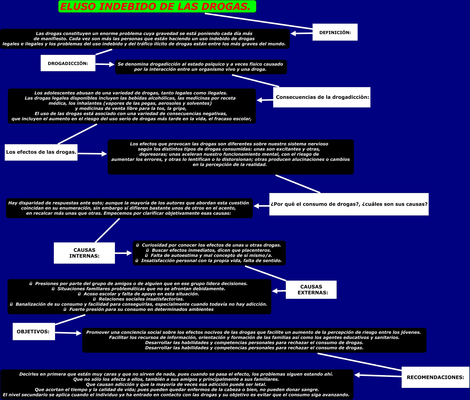 Este Cmap, tiene información relacionada con: Project-Solution_Diagram2, Promover una conciencia social sobre los efectos nocivos de las drogas que facilite un aumento de la percepción de riesgo entre los jóvenes. Facilitar los recursos de información, orientación y formación de las familias así como los agentes educativos y sanitarios. Desarrollar las habilidades y competencias personales para rechazar el consumo de drogas. Desarrollar las habilidades y competencias personales para rechazar el consumo de drogas. RECOMENDACIONES: Decirles en primera que están muy caras y que no sirven de nada, pues cuando se pasa el efecto, los problemas siguen estando ahí. Que no sólo los afecta a ellos, también a sus amigos y principalmente a sus familiares. Que causan adicción y que la mayoría de veces esa adicción puede ser letal. Que acortan el tiempo y la calidad de vida; pues pueden quedar enfermos de la cabeza o bien, no pueden donar sangre. El nivel secundario se aplica cuando el individuo ya ha entrado en contacto con las drogas y su objetivo es evitar que el consumo siga avanzando., ü Presiones por parte del grupo de amigos o de alguien que en ese grupo lidera decisiones. ü Situaciones familiares problemáticas que no se afrontan debidamente. ü Acoso escolar y falta de apoyo en esta situación. ü Relaciones sociales insatisfactorias. ü Banalización de su consumo y facilidad para conseguirlas, especialmente cuando todavía no hay adicción. ü Fuerte presión para su consumo en determinados ambientes OBJETIVOS: Promover una conciencia social sobre los efectos nocivos de las drogas que facilite un aumento de la percepción de riesgo entre los jóvenes. Facilitar los recursos de información, orientación y formación de las familias así como los agentes educativos y sanitarios. Desarrollar las habilidades y competencias personales para rechazar el consumo de drogas. Desarrollar las habilidades y competencias personales para rechazar el consumo de drogas., Hay disparidad de respuestas ante esto; aunque la mayoría de los autores que abordan esta cuestión coincidan en su enumeración, sin embargo sí difieren bastante unos de otros en el acento, en recalcar más unas que otras. Empecemos por clarificar objetivamente esas causas: CAUSAS INTERNAS: ü Curiosidad por conocer los efectos de unas u otras drogas. ü Buscar efectos inmediatos, dicen que placenteros. ü Falta de autoestima y mal concepto de sí mismo/a. ü Insatisfacción personal con la propia vida, falta de sentido., Los efectos que provocan las drogas son diferentes sobre nuestro sistema nervioso según los distintos tipos de drogas consumidas: unas son excitantes y otras, depresoras; unas aceleran nuestro funcionamiento mental, con el riesgo de aumentar los errores, y otras lo lentifican o lo distorsionan; otras producen alucinaciones o cambios en la percepción de la realidad. ¿Por qué el consumo de drogas?, ¿cuáles son sus causas? Hay disparidad de respuestas ante esto; aunque la mayoría de los autores que abordan esta cuestión coincidan en su enumeración, sin embargo sí difieren bastante unos de otros en el acento, en recalcar más unas que otras. Empecemos por clarificar objetivamente esas causas:, Las drogas constituyen un enorme problema cuya gravedad se está poniendo cada día más de manifiesto. Cada vez son más las personas que están haciendo un uso indebido de drogas legales e ilegales y los problemas del uso indebido y del tráfico ilícito de drogas están entre los más graves del mundo. DROGADICCIÓN: Se denomina drogadicción al estado psíquico y a veces físico causado por la interacción entre un organismo vivo y una droga., ELUSO INDEBIDO DE LAS DROGAS. DEFINICIÓN: Las drogas constituyen un enorme problema cuya gravedad se está poniendo cada día más de manifiesto. Cada vez son más las personas que están haciendo un uso indebido de drogas legales e ilegales y los problemas del uso indebido y del tráfico ilícito de drogas están entre los más graves del mundo., Los adolescentes abusan de una variedad de drogas, tanto legales como ilegales. Las drogas legales disponibles incluyen las bebidas alcohólicas, las medicinas por receta médica, los inhalantes (vapores de las pegas, aerosoles y solventes) y medicinas de venta libre para la tos, la gripe, El uso de las drogas está asociado con una variedad de consecuencias negativas, que incluyen el aumento en el riesgo del uso serio de drogas más tarde en la vida, el fracaso escolar, Los efectos de las drogas. Los efectos que provocan las drogas son diferentes sobre nuestro sistema nervioso según los distintos tipos de drogas consumidas: unas son excitantes y otras, depresoras; unas aceleran nuestro funcionamiento mental, con el riesgo de aumentar los errores, y otras lo lentifican o lo distorsionan; otras producen alucinaciones o cambios en la percepción de la realidad., Se denomina drogadicción al estado psíquico y a veces físico causado por la interacción entre un organismo vivo y una droga. Consecuencias de la drogadicción: Los adolescentes abusan de una variedad de drogas, tanto legales como ilegales. Las drogas legales disponibles incluyen las bebidas alcohólicas, las medicinas por receta médica, los inhalantes (vapores de las pegas, aerosoles y solventes) y medicinas de venta libre para la tos, la gripe, El uso de las drogas está asociado con una variedad de consecuencias negativas, que incluyen el aumento en el riesgo del uso serio de drogas más tarde en la vida, el fracaso escolar,, ü Curiosidad por conocer los efectos de unas u otras drogas. ü Buscar efectos inmediatos, dicen que placenteros. ü Falta de autoestima y mal concepto de sí mismo/a. ü Insatisfacción personal con la propia vida, falta de sentido. CAUSAS EXTERNAS: ü Presiones por parte del grupo de amigos o de alguien que en ese grupo lidera decisiones. ü Situaciones familiares problemáticas que no se afrontan debidamente. ü Acoso escolar y fal