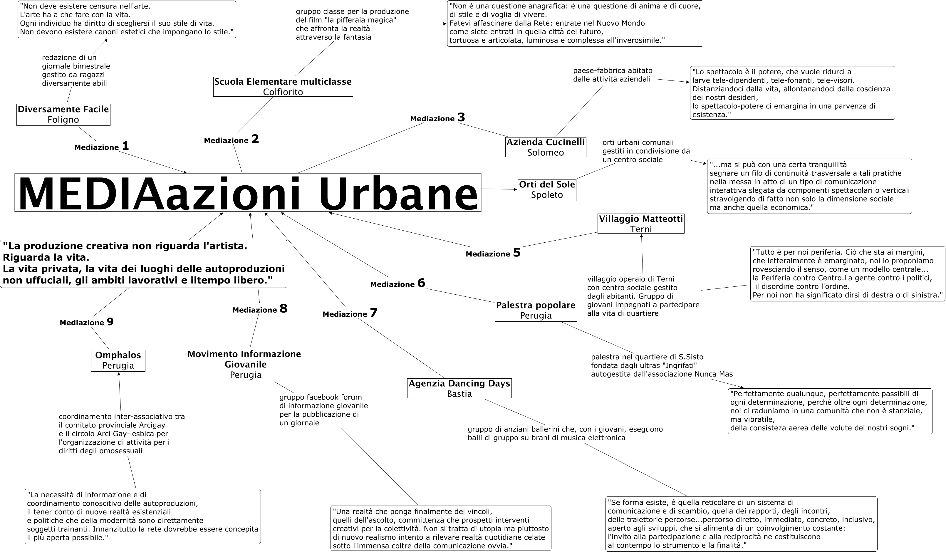 Questa Cmap, creata con IHMC CmapTools, contiene informazioni relative a: Television, Agenzia Dancing Days Bastia Mediazione 7 MEDIAazioni Urbane, Palestra popolare Perugia palestra nel quartiere di S.Sisto fondata dagli ultras "Ingrifati" autogestita dall'associazione Nunca Mas "Perfettamente qualunque, perfettamente passibili di ogni determinazione, perché oltre ogni determinazione, noi ci raduniamo in una comunità che non è stanziale, ma vibratile, della consisteza aerea delle volute dei nostri sogni.", Scuola Elementare multiclasse Colfiorito Mediazione 2 MEDIAazioni Urbane, Villaggio Matteotti Terni Mediazione 5 MEDIAazioni Urbane, Movimento Informazione Giovanile Perugia Mediazione 8 MEDIAazioni Urbane, MEDIAazioni Urbane Mediazione 4 Orti del Sole Spoleto, Movimento Informazione Giovanile Perugia gruppo facebook forum di informazione giovanile per la pubblicazione di un giornale "Una realtà che ponga finalmente dei vincoli, quelli dell'ascolto, committenza che prospetti interventi creativi per la colettività. Non si tratta di utopia ma piuttosto di nuovo realismo intento a rilevare realtà quotidiane celate sotto l'immensa coltre della comunicazione ovvia.", "Tutto è per noi periferia. Ciò che sta ai margini, che letteralmente è emarginato, noi lo proponiamo rovesciando il senso, come un modello centrale... la Periferia contro Centro.La gente contro i politici, il disordine contro l'ordine. Per noi non ha significato dirsi di destra o di sinistra." villaggio operaio di Terni con centro sociale gestito dagli abitanti. Gruppo di giovani impegnati a partecipare alla vita di quartiere Villaggio Matteotti Terni, Agenzia Dancing Days Bastia gruppo di anziani ballerini che, con i giovani, eseguono balli di gruppo su brani di musica elettronica "Se forma esiste, è quella reticolare di un sistema di comunicazione e di scambio, quella dei rapporti, degli incontri, delle traiettorie percorse...percorso diretto, immediato, concreto, inclusivo, aperto agli sviluppi, che si alimenta di un coinvolgimento costante: l'invito alla partecipazione e alla reciprocità ne costituiscono al contempo lo strumento e la finalità.", Orti del Sole Spoleto orti urbani comunali gestiti in condivisione da un centro sociale "...ma si può con una certa tranquillità segnare un filo di continuità trasversale a tali pratiche nella messa in atto di un tipo di comunicazione interattiva slegata da componenti spettacolari o verticali stravolgendo di fatto non solo la dimensione sociale ma anche quella economica.", "La necessità di informazione e di coordinamento conoscitivo delle autoproduzioni, il tener conto di nuove realtà esistenziali e politiche che della modernità sono direttamente soggetti trainanti. Innanzitutto la rete dovrebbe essere concepita il più aperta possibile." coordinamento inter-associativo tra il comitato provinciale Arcigay e il circolo Arci Gay-lesbica per l'organizzazione di attività per i diritti degli omosessuali Omphalos Perugia, Diversamente Facile Foligno Mediazione 1 MEDIAazioni Urbane, Azienda Cucinelli Solomeo Mediazione 3 MEDIAazioni Urbane, Palestra popolare Perugia Mediazione 6 MEDIAazioni Urbane, Scuola Elementare multiclasse Colfiorito gruppo classe per la produzione del film "la pifferaia magica" che affronta la realtà attraverso la fantasia "Non è una questione anagrafica: è una questione di anima e di cuore, di stile e di voglia di vivere. Fatevi affascinare dalla Rete: entrate nel Nuovo Mondo come siete entrati in quella città del futuro, tortuosa e articolata, luminosa e complessa all'inverosimile.", Omphalos Perugia Mediazione 9 MEDIAazioni Urbane, Diversamente Facile Foligno redazione di un giornale bimestrale gestito da ragazzi diversamente abili "Non deve esistere censura nell'arte. L'arte ha a che fare con la vita. Ogni individuo ha diritto di scegliersi il suo stile di vita. Non devono esistere canoni estetici che impongano lo stile.", Azienda Cucinelli Solomeo paese-fabbrica abitato dalle attività aziendali "Lo spettacolo è il potere, che vuole ridurci a larve tele-dipendenti, tele-fonanti, tele-visori. Distanziandoci dalla vita, allontanandoci dalla coscienza dei nostri desideri, lo spettacolo-potere ci emargina in una parvenza di esistenza."