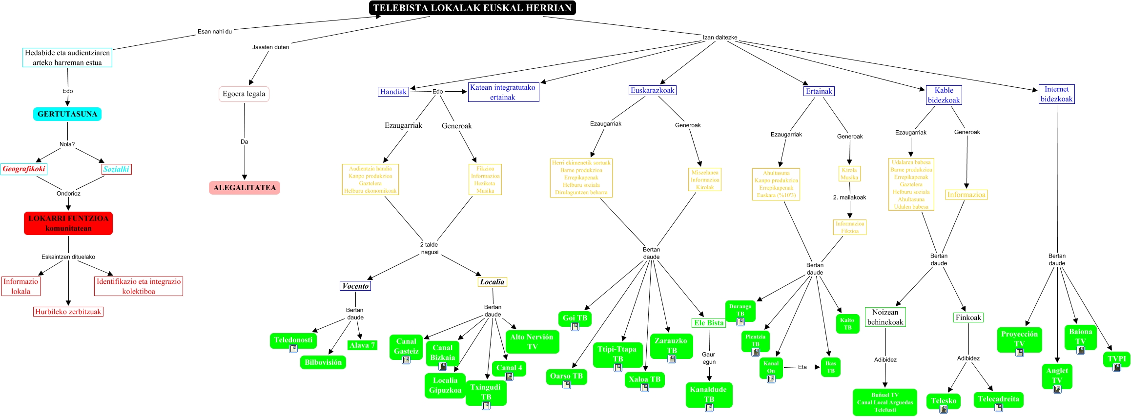 This Concept Map, created with IHMC CmapTools, has information related to: Telebista lokalak, Euskarazkoak Ezaugarriak Herri ekimenetik sortuak Barne produkzioa Errepikapenak Helburu soziala Dirulaguntzen beharra, Ahultasuna Kanpo produkzioa Errepikapenak Euskara (%10'3) Bertan daude Kanal On, Vocento Bertan daude Bilbovisión, Miszelanea Informazioa Kirolak Bertan daude Oarso TB, Udalaren babesa Barne produkzioa Errepikapenak Gaztelera Helburu soziala Ahultasuna Udalen babesa Bertan daude Noizean behinekoak, Miszelanea Informazioa Kirolak Bertan daude Xaloa TB, Internet bidezkoak Bertan daude Anglet TV, GERTUTASUNA Nola? Sozialki, Localia Bertan daude Canal 4, Localia Bertan daude Localia Gipuzkoa, Herri ekimenetik sortuak Barne produkzioa Errepikapenak Helburu soziala Dirulaguntzen beharra Bertan daude Goi TB, Informazioa Fikzioa Bertan daude Ikas TB, Miszelanea Informazioa Kirolak Bertan daude Ttipi-Ttapa TB, Vocento Bertan daude Teledonosti, Ahultasuna Kanpo produkzioa Errepikapenak Euskara (%10'3) Bertan daude Plentzia TB, Informazioa Fikzioa Bertan daude Kanal On, Herri ekimenetik sortuak Barne produkzioa Errepikapenak Helburu soziala Dirulaguntzen beharra Bertan daude Zarauzko TB, LOKARRI FUNTZIOA komunitatean Eskaintzen dituelako Identifikazio eta integrazio kolektiboa, Sozialki Ondorioz LOKARRI FUNTZIOA komunitatean, Finkoak Adibidez Telesko