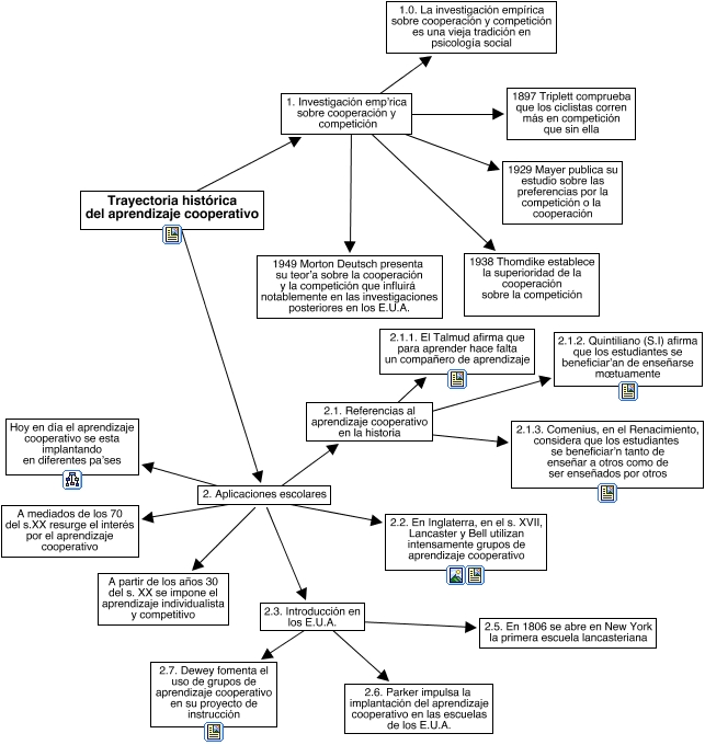 This Concept Map, created with IHMC CmapTools, has information related to: Historia, Trayectoria histórica del aprendizaje cooperativo ???? 2. Aplicaciones escolares, 2.3. Introducción en los E.U.A. ???? 2.6. Parker impulsa la implantación del aprendizaje cooperativo en las escuelas de los E.U.A., 2. Aplicaciones escolares ???? 2.2. En Inglaterra, en el s. XVII, Lancaster y Bell utilizan intensamente grupos de aprendizaje cooperativo, 2. Aplicaciones escolares ???? 2.1. Referencias al aprendizaje cooperativo en la historia, 1. Investigación emp’rica sobre cooperación y competición ???? 1938 Thomdike establece la superioridad de la cooperación sobre la competición, 2.1. Referencias al aprendizaje cooperativo en la historia ???? 2.1.2. Quintiliano (S.I) afirma que los estudiantes se beneficiar’an de enseñarse mœtuamente, Trayectoria histórica del aprendizaje cooperativo ???? 1. Investigación emp’rica sobre cooperación y competición, 2.3. Introducción en los E.U.A. ???? 2.7. Dewey fomenta el uso de grupos de aprendizaje cooperativo en su proyecto de instrucción, 2. Aplicaciones escolares ???? A partir de los años 30 del s. XX se impone el aprendizaje individualista y competitivo, 1. Investigación emp’rica sobre cooperación y competición ???? 1897 Triplett comprueba que los ciclistas corren más en competición que sin ella, 1. Investigación emp’rica sobre cooperación y competición ???? 1929 Mayer publica su estudio sobre las preferencias por la competición o la cooperación, 2. Aplicaciones escolares ???? Hoy en día el aprendizaje cooperativo se esta implantando en diferentes pa’ses, 2.3. Introducción en los E.U.A. ???? 2.5. En 1806 se abre en New York la primera escuela lancasteriana, 1. Investigación emp’rica sobre cooperación y competición ???? 1.0. La investigación empírica sobre cooperación y competición es una vieja tradición en psicología social, 2.1. Referencias al aprendizaje cooperativo en la historia ???? 2.1.1. El Talmud afirma que para aprender hace falta un compañero de aprendizaje, 2. Aplicaciones escolares ???? 2.3. Introducción en los E.U.A., 1. Investigación emp’rica sobre cooperación y competición ???? 1949 Morton Deutsch presenta su teor’a sobre la cooperación y la competición que influirá notablemente en las investigaciones posteriores en los E.U.A., 2.1. Referencias al aprendizaje cooperativo en la historia ???? 2.1.3. Comenius, en el Renacimiento, considera que los estudiantes se beneficiar’n tanto de enseñar a otros como de ser enseñados por otros, 2. Aplicaciones escolares ???? A mediados de los 70 del s.XX resurge el interés por el aprendizaje cooperativo