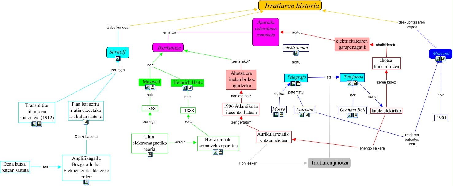 This Concept Map, created with IHMC CmapTools, has information related to: BarrenetxeaArean, Telegrafo eta Telefonoa, Dena kutxa batean sartuta non Anplifikagailu Bozgarailu bat Frekuentziak aldatzeko ruleta, kable elektriko zeren bidez ahotsa transmititzea, Graham Bell nor Telefonoa, elektrizitatearen garapenagatik sortu Aparailu ezberdinen asmaketa, Ikerkuntza emaitza Irratiaren historia, Telegrafo sortu elektroiman, 1901 noiz Marconi, Transmititu titanic-en suntziketa (1912) zer egin Sarnoff, 1868 noiz Maxwell, Plan bat sortu irratia etxeetako artikulua izateko zer egin Sarnoff, 1906 Atlantikoan itasontzi batean non eta noiz Ahotsa era inalambrikoz igortzeko, Marconi Irratiaren patentea lortu Marconi, Irratiaren jaiotza eta Telefonoa, 1888 noiz Heinrich Hertz, Hertz uhinak somatzeko aparatua sortu 1888, Sarnoff Zabalkundea Irratiaren historia, Aurikularretatik entzun ahotsa Honi esker Irratiaren jaiotza, Anplifikagailu Bozgarailu bat Frekuentziak aldatzeko ruleta Deskribapena Plan bat sortu irratia etxeetako artikulua izateko, Heinrich Hertz nor Ikerkuntza