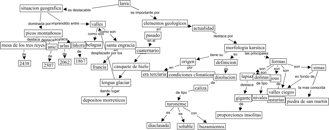 This Concept Map, created with IHMC CmapTools, has information related to: larra, anie de 2507, elementos geologicos en actualidad, formas son lapiaz, formas son valles ciegos, picos montañosos destaca arlas, turonense es diaclasada, jous de asturias, dolinas de tipo nivales, formas son jous, cuaternario hubo casquete de hielo, lakora de 1867, formas son lapiaz, lengua glaciar desplazado por los valles, larra es destacable situacion geografica, morfologia karstica las principales formas, picos montañosos destaca mesa de los tres reyes, arlas de 2062, lapiaz destaca gigante, caliza de tipo turonense, actualidad destaca por morfologia karstica
