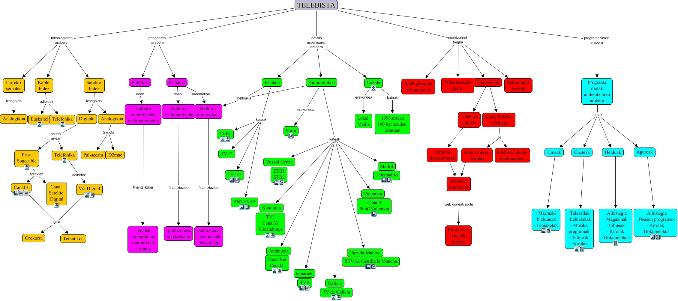 Este Cmap, tiene información relacionada con: Telebistak, Kate espezia- lizatuak . telebistak interneten, Programa motak audientziaren arabera motak Agureak, Estatala kateak TVE1, Publikoa doan Helburu komertzialak Ez komertzialak, Tendentziak bi Telebista digitala, TELEBISTA emisio esparruaren arabera Lokala, TELEBISTA emisio esparruaren arabera Autonomikoa, Pribatua ordainekoa Helburu komertziala, Autonomikoa kateak Madril, Telebista digitala . zerbitzu interaktiboak, Canal Satelite Digital gaia Orokorra, Lokala kateak 1998.urtean 100 bat zeuden estatuan, TELEBISTA etorkizunari begira Analogikoaren desagerpena, Autonomikoa erakundea Forta, Digitala hauen artean Prisa Sogecable, Estatala kateak TVE2, Prisa Sogecable adibidez Canal +, Satelite bidez izango da Analogikoa, Programa motak audientziaren arabera motak Helduak, Canal Satelite Digital gaia Tematikoa