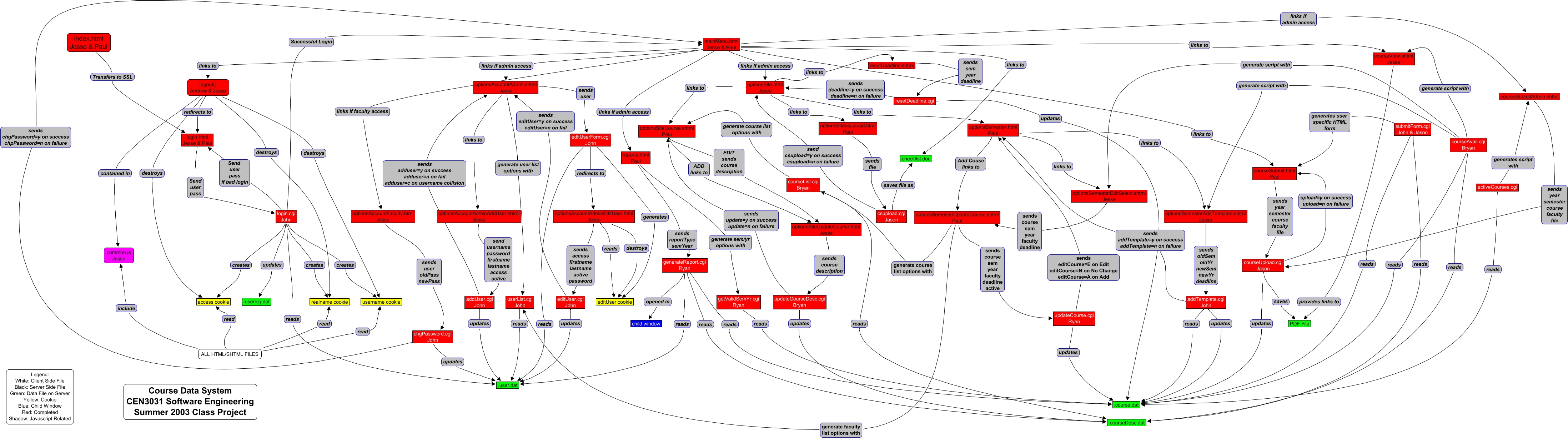 This Concept Map, created with IHMC CmapTools, has information related to: CDS, optionsSite.html Jesse links to optionsSiteCourse.shtml Paul, activeCourses.cgi reads .course.dat, optionsSemesterUpdateCourse.shtml Paul sends course sem year faculty deadline active updateCourse.cgi Ryan, addUser.cgi John sends adduser=y on success adduser=n on fail adduser=c on username collision optionsAccountAdmin.shtml Jesse, courseAvail.cgi Bryan generate script with optionsSemesterAddTemplate.shtml Jesse, optionsSite.html Jesse links to resetDeadline.shtml, courseView.shtml Jesse provides links to PDF File, editUserForm.cgi John reads .user.dat, generateReport.cgi Ryan opened in child window, optionsAccountAdminEditUser.html Jesse destroys editUser cookie, ALL HTML/SHTML FILES include common.js Jesse, optionsSemester.html Paul links to optionsSemesterAddTemplate.shtml Jesse, submitForm.cgi John & Jason generates user specific HTML form courseSubmit.html Paul, generateReport.cgi Ryan reads .user.dat, csupload.cgi Jason saves file as checklist.doc, reports.html Paul generate sem/yr options with getValidSemYr.cgi Ryan, addTemplate.cgi John updates .course.dat, addTemplate.cgi John sends addTemplate=y on success addTemplate=n on failure optionsSemester.html Paul, editUserForm.cgi John redirects to optionsAccountAdminEditUser.html Jesse, chgPassword.cgi John sends chgPassword=y on success chpPassword=n on failure mainMenu.html Jesse & Paul