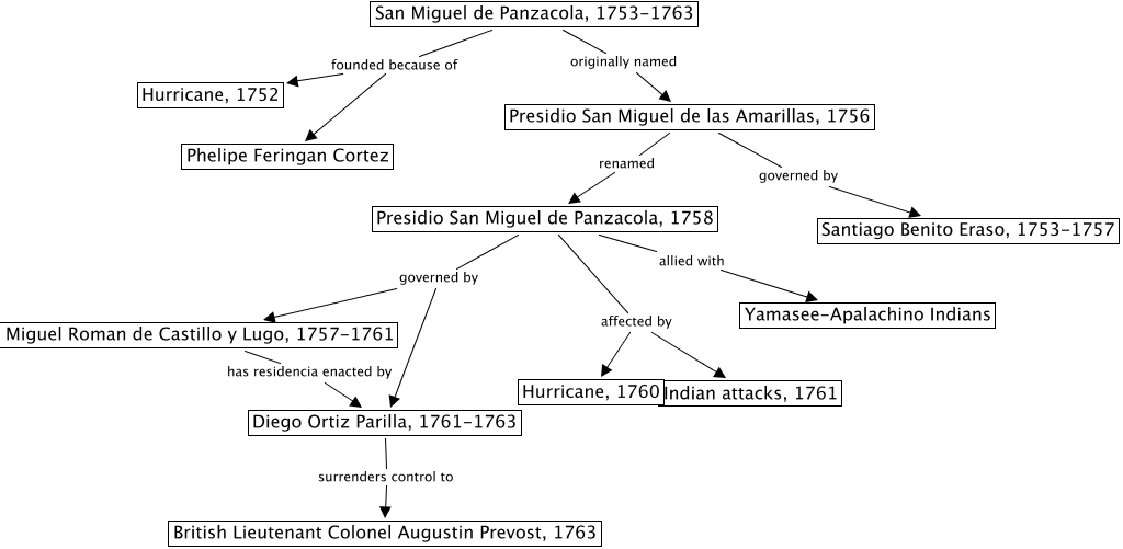 This Concept Map, created with IHMC CmapTools, has information related to: San Miguel de Panzacola_ 1753-1763, Presidio San Miguel de Panzacola, 1758 allied with Yamasee-Apalachino Indians, Presidio San Miguel de las Amarillas, 1756 governed by Santiago Benito Eraso, 1753-1757, Presidio San Miguel de Panzacola, 1758 governed by Miguel Roman de Castillo y Lugo, 1757-1761, Presidio San Miguel de Panzacola, 1758 governed by Diego Ortiz Parilla, 1761-1763, Presidio San Miguel de las Amarillas, 1756 renamed Presidio San Miguel de Panzacola, 1758, Presidio San Miguel de Panzacola, 1758 affected by Hurricane, 1760, San Miguel de Panzacola, 1753-1763 founded because of Hurricane, 1752, Miguel Roman de Castillo y Lugo, 1757-1761 has residencia enacted by Diego Ortiz Parilla, 1761-1763, Diego Ortiz Parilla, 1761-1763 surrenders control to British Lieutenant Colonel Augustin Prevost, 1763, San Miguel de Panzacola, 1753-1763 founded because of Phelipe Feringan Cortez, San Miguel de Panzacola, 1753-1763 originally named Presidio San Miguel de las Amarillas, 1756, Presidio San Miguel de Panzacola, 1758 affected by Indian attacks, 1761