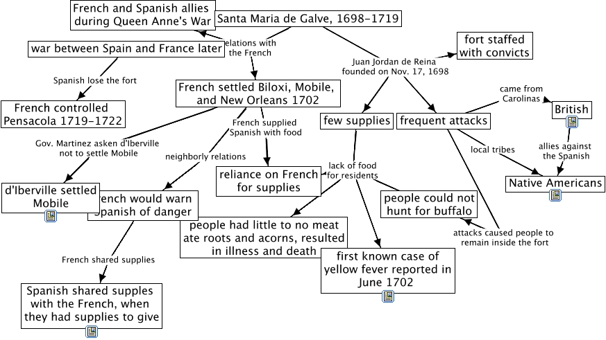 This Concept Map, created with IHMC CmapTools, has information related to: de glave, people could not hunt for buffalo lack of food for residents people had little to no meat ate roots and acorns, resulted in illness and death, Santa Maria de Galve, 1698-1719 relations with the French French and Spanish allies during Queen Anne's War, Santa Maria de Galve, 1698-1719 Juan Jordan de Reina founded on Nov. 17, 1698 few supplies, few supplies lack of food for residents people had little to no meat ate roots and acorns, resulted in illness and death, frequent attacks came from Carolinas British, British allies against the Spanish Native Americans, frequent attacks attacks caused people to remain inside the fort people could not hunt for buffalo, people could not hunt for buffalo lack of food for residents reliance on French for supplies, French settled Biloxi, Mobile, and New Orleans 1702 neighborly relations French would warn Spanish of danger, people could not hunt for buffalo lack of food for residents first known case of yellow fever reported in June 1702, French settled Biloxi, Mobile, and New Orleans 1702 Gov. Martinez asken d'Iberville not to settle Mobile d'Iberville settled Mobile, Santa Maria de Galve, 1698-1719 relations with the French French settled Biloxi, Mobile, and New Orleans 1702, few supplies lack of food for residents reliance on French for supplies, French would warn Spanish of danger French shared supplies Spanish shared supples with the French, when they had supplies to give, few supplies lack of food for residents first known case of yellow fever reported in June 1702, Santa Maria de Galve, 1698-1719 Juan Jordan de Reina founded on Nov. 17, 1698 fort staffed with convicts, war between Spain and France later Spanish lose the fort French controlled Pensacola 1719-1722, frequent attacks local tribes Native Americans, Santa Maria de Galve, 1698-1719 relations with the French war between Spain and France later, Santa Maria de Galve, 1698-1719 Juan Jordan de Reina founded on Nov. 17, 1698 frequent attacks
