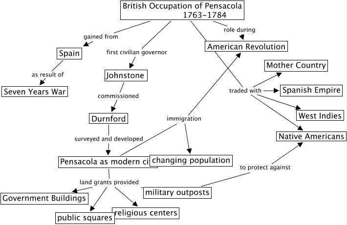 This Concept Map, created with IHMC CmapTools, has information related to: British Occupation of Pensacola, Durnford surveyed and developed Pensacola as modern city, British Occupation of Pensacola 1763-1784 traded with Mother Country, British Occupation of Pensacola 1763-1784 role during American Revolution, British Occupation of Pensacola 1763-1784 first civilian governor Johnstone, British Occupation of Pensacola 1763-1784 traded with Spanish Empire, Pensacola as modern city immigration changing population, Spain as result of Seven Years War, British Occupation of Pensacola 1763-1784 traded with West Indies, Pensacola as modern city land grants provided public squares, Pensacola as modern city land grants provided Government Buildings, Pensacola as modern city immigration American Revolution, Pensacola as modern city land grants provided religious centers, British Occupation of Pensacola 1763-1784 gained from Spain, Johnstone commissioned Durnford, military outposts to protect against Native Americans, Pensacola as modern city land grants provided military outposts, British Occupation of Pensacola 1763-1784 traded with Native Americans