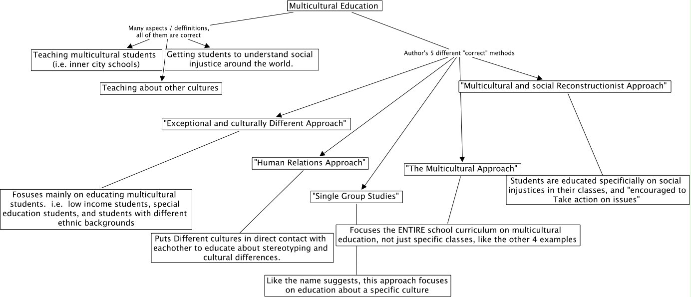 Dieses mit IHMC CmapTools erstellte CMap hat Informationen bezüglich: multicultural education, Multicultural Education Author's 5 different "correct" methods "Single Group Studies", "Exceptional and culturally Different Approach" Fosuses mainly on educating multicultural students. i.e. low income students, special education students, and students with different ethnic backgrounds, Multicultural Education Many aspects / deffinitions, all of them are correct Teaching about other cultures, "The Multicultural Approach" Focuses the ENTIRE school curriculum on multicultural education, not just specific classes, like the other 4 examples, "Multicultural and social Reconstructionist Approach" Students are educated specificially on social injustices in their classes, and "encouraged to Take action on issues", Multicultural Education Author's 5 different "correct" methods "Human Relations Approach", Multicultural Education Author's 5 different "correct" methods "Exceptional and culturally Different Approach", "Single Group Studies" Like the name suggests, this approach focuses on education about a specific culture, Multicultural Education Many aspects / deffinitions, all of them are correct Getting students to understand social injustice around the world., "Human Relations Approach" Puts Different cultures in direct contact with eachother to educate about stereotyping and cultural differences., Multicultural Education Many aspects / deffinitions, all of them are correct Teaching multicultural students (i.e. inner city schools), Multicultural Education Author's 5 different "correct" methods "The Multicultural Approach", Multicultural Education Author's 5 different "correct" methods "Multicultural and social Reconstructionist Approach"