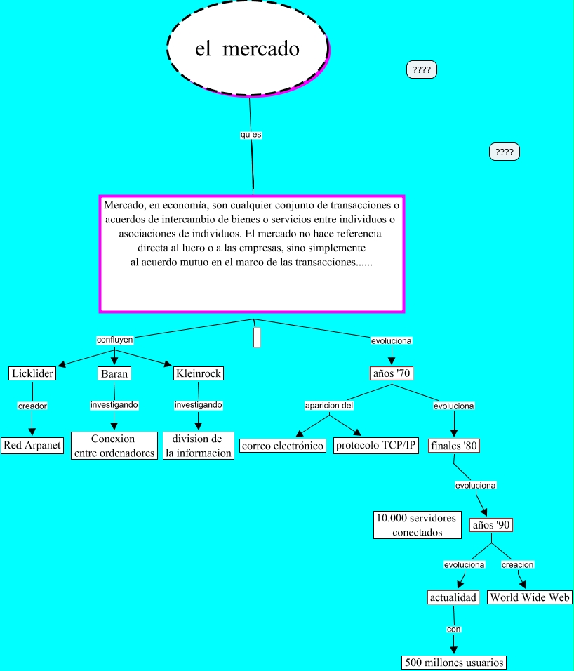 Este Cmap, tiene información relacionada con: modulo 1 (historia), años '90 creacion World Wide Web, años '90 evoluciona actualidad, confluyen Licklider, años '70 aparicion del protocolo TCP/IP, confluyen Kleinrock, actualidad con 500 millones usuarios, Kleinrock investigando division de la informacion, finales '80 evoluciona años '90, evoluciona años '70, Baran investigando Conexion entre ordenadores, confluyen Baran, el mercado qu es Mercado, en economía, son cualquier conjunto de transacciones o acuerdos de intercambio de bienes o servicios entre individuos o asociaciones de individuos. El mercado no hace referencia directa al lucro o a las empresas, sino simplemente al acuerdo mutuo en el marco de las transacciones......, Licklider creador Red Arpanet, años '70 aparicion del correo electrónico, años '70 evoluciona finales '80
