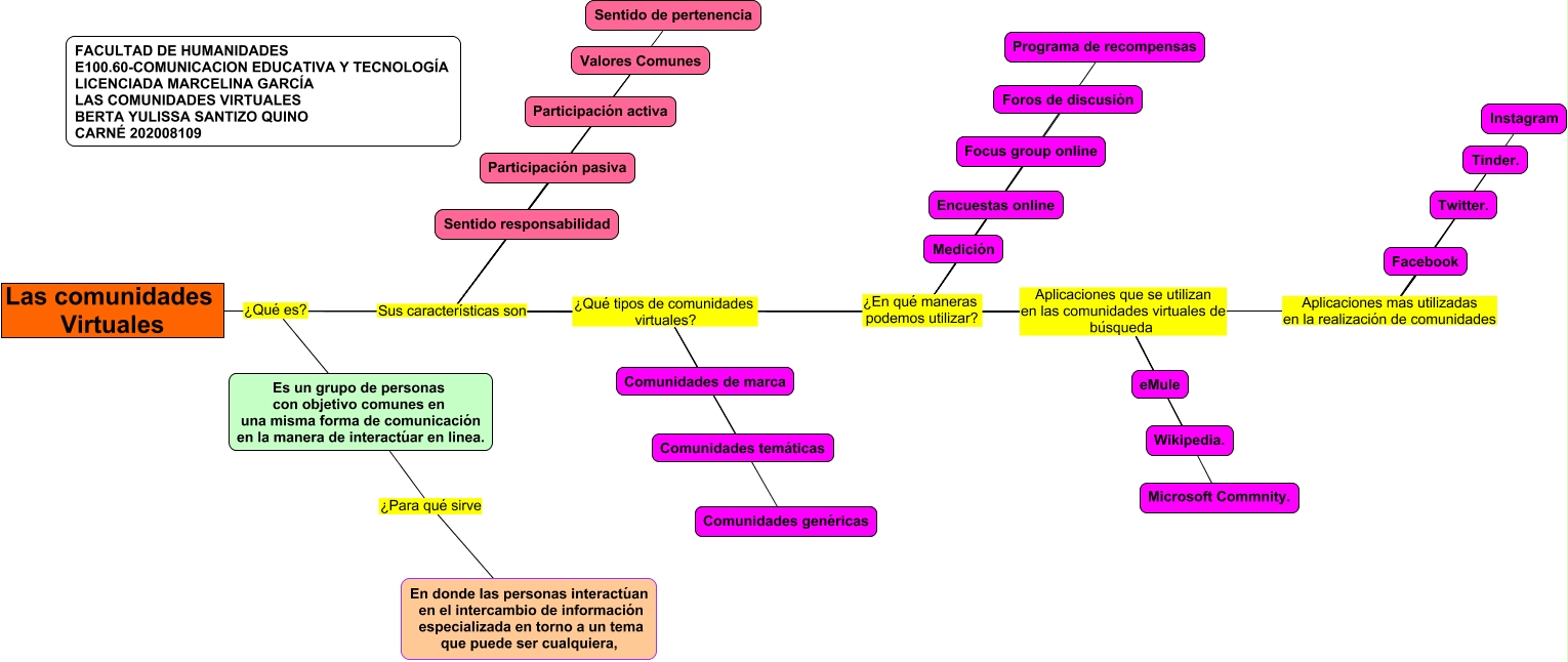 Este Cmap, tiene información relacionada con: activividades, Las comunidades Virtuales ¿Qué tipos de comunidades virtuales? Comunidades genéricas, Las comunidades Virtuales Aplicaciones que se utilizan en las comunidades virtuales de búsqueda Microsoft Commnity., Las comunidades Virtuales ¿En qué maneras podemos utilizar? Programa de recompensas, Las comunidades Virtuales ¿Qué tipos de comunidades virtuales? Comunidades temáticas, Las comunidades Virtuales Aplicaciones mas utilizadas en la realización de comunidades Instagram, Las comunidades Virtuales Sus características son Participación pasiva, Las comunidades Virtuales Aplicaciones mas utilizadas en la realización de comunidades Tinder., Es un grupo de personas con objetivo comunes en una misma forma de comunicación en la manera de interactúar en linea. ¿Para qué sirve En donde las personas interactúan en el intercambio de información especializada en torno a un tema que puede ser cualquiera,, Las comunidades Virtuales Sus características son Valores Comunes, Las comunidades Virtuales ¿En qué maneras podemos utilizar? Medición, Las comunidades Virtuales Aplicaciones mas utilizadas en la realización de comunidades Twitter., Las comunidades Virtuales Aplicaciones que se utilizan en las comunidades virtuales de búsqueda Wikipedia., Las comunidades Virtuales ¿En qué maneras podemos utilizar? Encuestas online, Las comunidades Virtuales ¿En qué maneras podemos utilizar? Foros de discusión, Las comunidades Virtuales ¿Qué es? Es un grupo de personas con objetivo comunes en una misma forma de comunicación en la manera de interactúar en linea., Las comunidades Virtuales Aplicaciones que se utilizan en las comunidades virtuales de búsqueda eMule, Las comunidades Virtuales ¿En qué maneras podemos utilizar? Focus group online, Las comunidades Virtuales Aplicaciones mas utilizadas en la realización de comunidades Facebook, Las comunidades Virtuales ¿Qué tipos de comunidades virtuales? Comunidades de marca, Las comunidades Virtuales Sus características son Participación activa