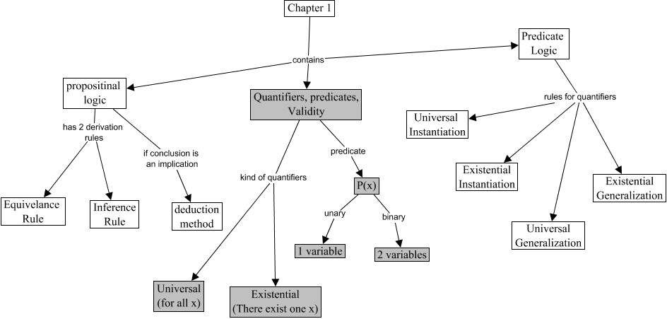 This Concept Map, created with IHMC CmapTools, has information related to: CH1, Quantifiers, predicates, Validity kind of quantifiers Universal (for all x), Predicate Logic rules for quantifiers Universal Generalization, Chapter 1 contains propositinal logic, P(x) unary 1 variable, propositinal logic if conclusion is an implication deduction method, Chapter 1 contains Predicate Logic, Quantifiers, predicates, Validity kind of quantifiers Existential (There exist one x), Quantifiers, predicates, Validity predicate P(x), Predicate Logic rules for quantifiers Existential Instantiation, Predicate Logic rules for quantifiers Universal Instantiation, P(x) binary 2 variables, propositinal logic has 2 derivation rules Inference Rule, Predicate Logic rules for quantifiers Existential Generalization, Chapter 1 contains Quantifiers, predicates, Validity, propositinal logic has 2 derivation rules Equivelance Rule