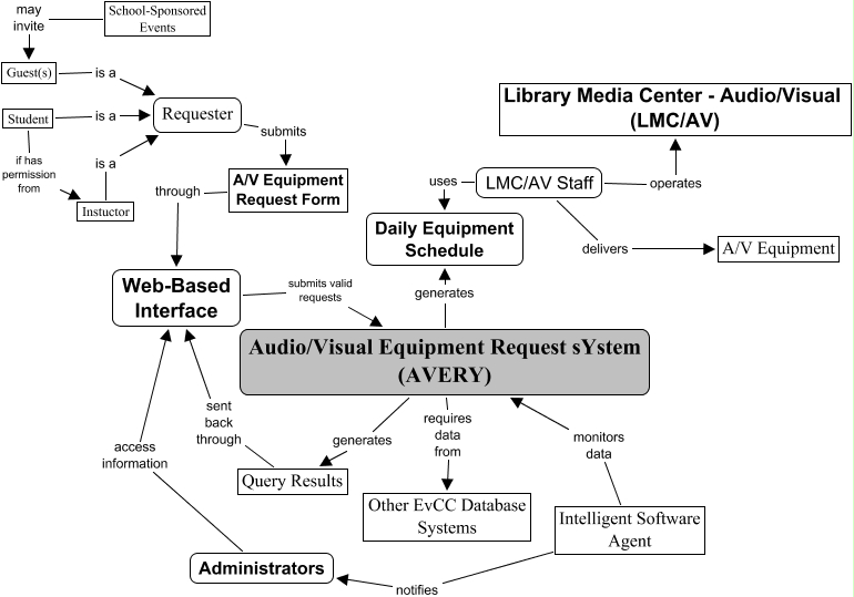 This Concept Map, created with IHMC CmapTools, has information related to: AVERY, Audio/Visual Equipment Request sYstem (AVERY) requires data from Other EvCC Database Systems, LMC/AV Staff operates Library Media Center - Audio/Visual (LMC/AV), Requester submits A/V Equipment Request Form, Guest(s) is a Requester, School-Sponsored Events may invite Guest(s), Query Results sent back through Web-Based Interface, LMC/AV Staff delivers A/V Equipment, Instuctor is a Requester, Web-Based Interface submits valid requests Audio/Visual Equipment Request sYstem (AVERY), Student if has permission from Instuctor, Student is a Requester, Audio/Visual Equipment Request sYstem (AVERY) generates Query Results, Intelligent Software Agent monitors data Audio/Visual Equipment Request sYstem (AVERY), A/V Equipment Request Form through Web-Based Interface, Administrators access information Web-Based Interface, LMC/AV Staff uses Daily Equipment Schedule, Intelligent Software Agent notifies Administrators, Audio/Visual Equipment Request sYstem (AVERY) generates Daily Equipment Schedule