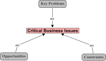 This Concept Map, created with IHMC CmapTools, has information related to: Critical Business Issues, Opportunities are Critical Business Issues, Key Problems are Critical Business Issues, Constraints are Critical Business Issues