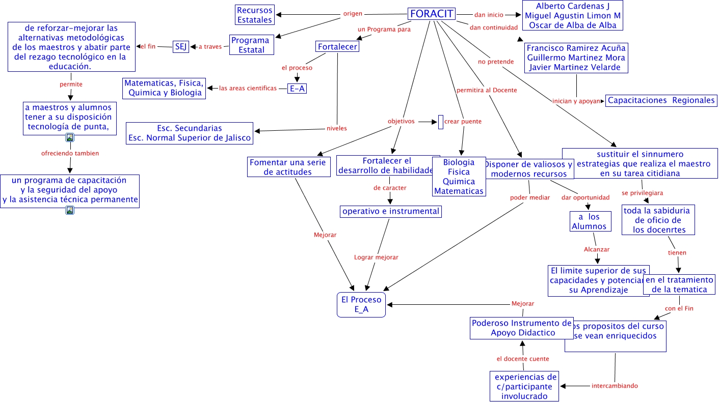 This Concept Map, created with IHMC CmapTools, has information related to: Foracit, FORACIT dan inicio Alberto Cardenas J Miguel Agustin Limon M Oscar de Alba de Alba, Francisco Ramirez Acuña Guillermo Martinez Mora Javier Martinez Velarde inician y apoyan Capacitaciones Regionales, Programa Estatal a traves SEJ, SEJ el fin de reforzar-mejorar las alternativas metodológicas de los maestros y abatir parte del rezago tecnológico en la educación., Disponer de valiosos y modernos recursos poder mediar El Proceso E_A, operativo e instrumental Lograr mejorar El Proceso E_A, toda la sabiduria de oficio de los docenrtes tienen en el tratamiento de la tematica, Fomentar una serie de actitudes Mejorar El Proceso E_A, FORACIT no pretende sustituir el sinnumero de estrategias que realiza el maestro en su tarea citidiana, Fortalecer el desarrollo de habilidades de caracter operativo e instrumental, FORACIT origen Recursos Estatales, Poderoso Instrumento de Apoyo Didactico Mejorar El Proceso E_A, FORACIT dan continuidad Francisco Ramirez Acuña Guillermo Martinez Mora Javier Martinez Velarde, FORACIT permitira al Docente Disponer de valiosos y modernos recursos, Fortalecer el proceso E-A, sustituir el sinnumero de estrategias que realiza el maestro en su tarea citidiana se privilegiara toda la sabiduria de oficio de los docenrtes, FORACIT objetivos, Los propositos del curso se vean enriquecidos intercambiando experiencias de c/participante involucrado, FORACIT origen Programa Estatal, a maestros y alumnos tener a su disposición tecnología de punta, ofreciendo tambien un programa de capacitación y la seguridad del apoyo y la asistencia técnica permanente