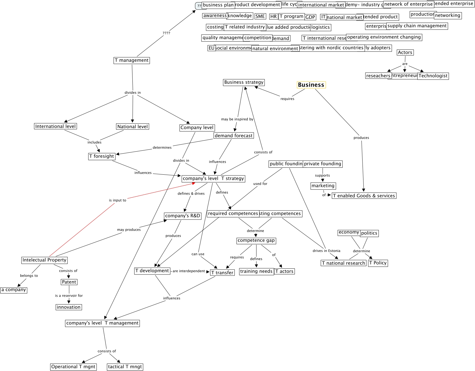 This Concept Map, created with IHMC CmapTools, has information related to: wp5 management of technology, Business produces T enabled Goods & services, T management ???? ????, Business strategy may be inspired by demand forecast, Patent is a reservoir for innovation, Business requires Business strategy, marketing of T enabled Goods & services, Intelectual Property consists of Patent, company's level T strategy can use T transfer, public founding drives in Estonia T national research, Company level divides in company's level T management, International level includes T foresight, company's level T strategy defines required competences, economy determine T Policy, politics determine T Policy, T management divides in International level, T national research determine T Policy, company's level T management consists of Operational T mgnt, competence gap of T actors, T management divides in National level, Actors are entrepreneurs