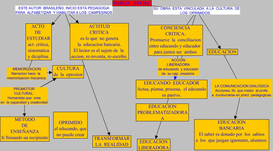 Este Cmap, tiene información relacionada con: Pablo Freire, PABLO FREIRE ESTE AUTOR BRASILEÑO, INICIO ESTA PEDAGOGIA PARA ALFABETIZAR Y HABILITAR A LOS CAMPESINOS TRANSFORMAR LA REALIDAD, PABLO FREIRE ESTE AUTOR BRASILEÑO, INICIO ESTA PEDAGOGIA PARA ALFABETIZAR Y HABILITAR A LOS CAMPESINOS ACTO DE ESTUDIAR act. critica, sistematica y diciplina., CONCIENCIA CRITICA. Promueve la conciliacion entre educando y educador para juntos ser ambos SU OBRA ESTA VINCULADA A LA CULTURA DE LOS OPRIMIDOS. EDUCACION, PABLO FREIRE SU OBRA ESTA VINCULADA A LA CULTURA DE LOS OPRIMIDOS. EDUCACION, CONCIENCIA CRITICA. Promueve la conciliacion entre educando y educador para juntos ser ambos ACCION LIBERADORA de educando y educador de su cap. creadora. EDUCANDO EDUCADOR Actua, piensa, procesa, el edecando es pasivo., CONCIENCIA CRITICA. Promueve la conciliacion entre educando y educador para juntos ser ambos SU OBRA ESTA VINCULADA A LA CULTURA DE LOS OPRIMIDOS. EDUCACION LIBERADORA, CULTURA de la opresion PROMOTOR CULTURAL. Humanista que crea en la capacidad y creatividad METODO DE ENSEÑANZA Ir llenando un recipiente, ACTO DE ESTUDIAR act. critica, sistematica y diciplina. MEMORIZACION Narracion hace la memorizacion mecanica. CULTURA de la opresion, PABLO FREIRE SU OBRA ESTA VINCULADA A LA CULTURA DE LOS OPRIMIDOS. EDUCACION LIBERADORA, PABLO FREIRE ESTE AUTOR BRASILEÑO, INICIO ESTA PEDAGOGIA PARA ALFABETIZAR Y HABILITAR A LOS CAMPESINOS ACTITUD CRITICA es lo que no genera la educacion bancaria. El lector es el sujeto de la accion, re-inventa, re-escribe., EDUCACION LA COMUNICACION DIALOGICA Acciones, lib. que instan al profe. a involucrarse en pract. pedagogicas. EDUCACION BANCARIA El saber es donado por los sabios a los que juzgan ignorante, alumnos