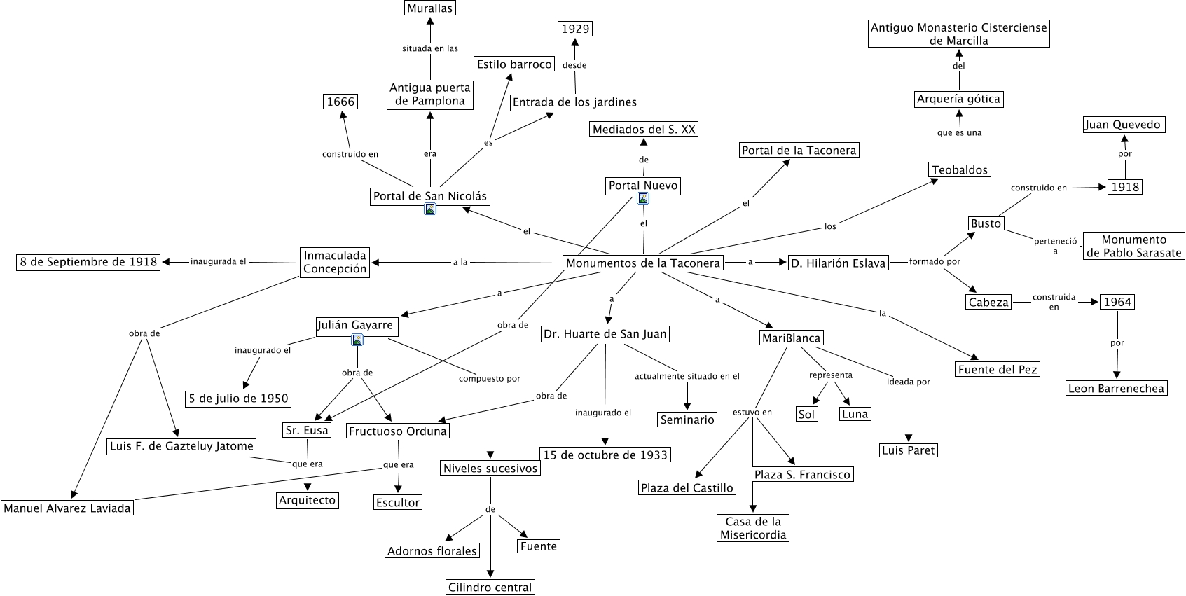 This Concept Map, created with IHMC CmapTools, has information related to: MonumentosTaconera, Monumentos de la Taconera el Portal de la Taconera, Monumentos de la Taconera a Dr. Huarte de San Juan, Portal de San Nicolás construido en 1666, Portal de San Nicolás es Entrada de los jardines, Antigua puerta de Pamplona situada en las Murallas, Portal Nuevo obra de Sr. Eusa, Monumentos de la Taconera la Fuente del Pez, Teobaldos que es una Arquería gótica, Monumentos de la Taconera el Portal Nuevo, Entrada de los jardines desde 1929, Luis F. de Gazteluy Jatome que era Arquitecto, Manuel Alvarez Laviada que era Escultor, Dr. Huarte de San Juan actualmente situado en el Seminario, MariBlanca representa Luna, D. Hilarión Eslava formado por Cabeza, Niveles sucesivos de Fuente, Portal Nuevo de Mediados del S. XX, Monumentos de la Taconera a Julián Gayarre, Portal de San Nicolás era Antigua puerta de Pamplona, MariBlanca estuvo en Plaza del Castillo