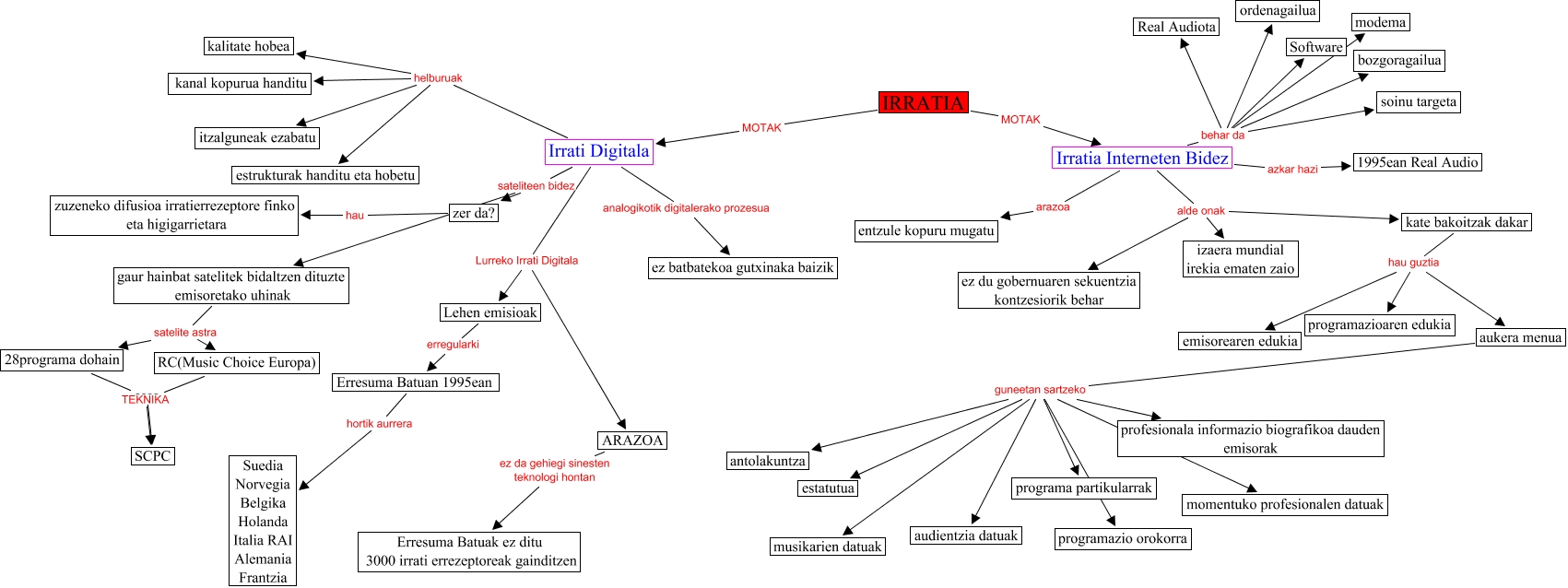 This Concept Map, created with IHMC CmapTools, has information related to: Irratia Internet bidez, Irrati Digitala helburuak estrukturak handitu eta hobetu, IRRATIA MOTAK Irrati Digitala, Irratia Interneten Bidez behar da modema, gaur hainbat satelitek bidaltzen dituzte emisoretako uhinak satelite astra 28programa dohain, Irrati Digitala sateliteen bidez gaur hainbat satelitek bidaltzen dituzte emisoretako uhinak, kate bakoitzak dakar hau guztia aukera menua, Irratia Interneten Bidez behar da ordenagailua, Irrati Digitala helburuak itzalguneak ezabatu, Irrati Digitala sateliteen bidez zer da?, ARAZOA ez da gehiegi sinesten teknologi hontan Erresuma Batuak ez ditu 3000 irrati errezeptoreak gainditzen, RC(Music Choice Europa) TEKNIKA SCPC, IRRATIA MOTAK Irratia Interneten Bidez, Irratia Interneten Bidez arazoa entzule kopuru mugatu, aukera menua guneetan sartzeko musikarien datuak, Irratia Interneten Bidez behar da Real Audiota, zer da? hau zuzeneko difusioa irratierrezeptore finko eta higigarrietara, Irrati Digitala helburuak kanal kopurua handitu, aukera menua guneetan sartzeko programa partikularrak, Irrati Digitala analogikotik digitalerako prozesua ez batbatekoa gutxinaka baizik, 28programa dohain ???? SCPC