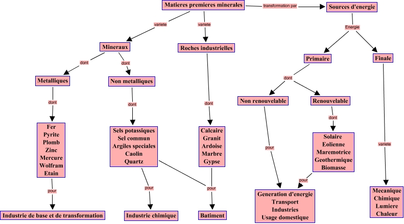 Cette carte conceptuelle, cree avec IHMC CmapTools, contient des informations liees a : Matieres premieres, Sources d'energie Energie Primaire, Non renouvelable pour Generation d'energie Transport Industries Usage domestique, Matieres premieres minerales variete Roches industrielles, Primaire dont Renouvelable, Roches industrielles dont Calcaire Granit Ardoise Marbre Gypse, Sources d'energie Energie Finale, Renouvelable dont Solaire Eolienne Maremotrice Geothermique Biomasse, Solaire Eolienne Maremotrice Geothermique Biomasse pour Generation d'energie Transport Industries Usage domestique, Sels potassiques Sel commun Argiles speciales Caolin Quartz pour Batiment, Primaire dont Non renouvelable, Mineraux dont Non metalliques, Sels potassiques Sel commun Argiles speciales Caolin Quartz pour Industrie chimique, Non metalliques dont Sels potassiques Sel commun Argiles speciales Caolin Quartz, Matieres premieres minerales transformation par Sources d'energie, Metalliques dont Fer Pyrite Plomb Zinc Mercure Wolfram Etain, Calcaire Granit Ardoise Marbre Gypse pour Batiment, Finale variete Mecanique Chimique Lumiere Chaleur, Matieres premieres minerales variete Mineraux, Mineraux dont Metalliques, Fer Pyrite Plomb Zinc Mercure Wolfram Etain pour Industrie de base et de transformation