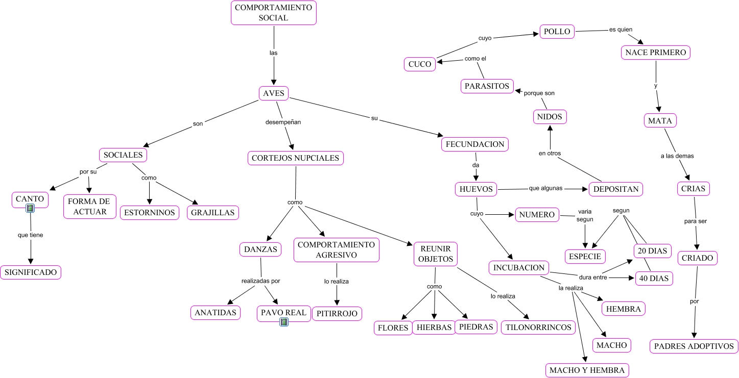Este Cmap, tiene información relacionada con: COMPORTAMIENTO SOCIAL, NIDOS porque son PARASITOS, HUEVOS cuyo INCUBACION, INCUBACION la realiza MACHO, 20 DIAS segun ESPECIE, AVES son SOCIALES, AVES desempeñan CORTEJOS NUPCIALES, AVES su FECUNDACION, SOCIALES como GRAJILLAS, SOCIALES por su FORMA DE ACTUAR, CRIAS para ser CRIADO, DANZAS realizadas por ANATIDAS, COMPORTAMIENTO AGRESIVO lo realiza PITIRROJO, MATA a las demas CRIAS, HUEVOS que algunas DEPOSITAN, REUNIR OBJETOS como FLORES, FECUNDACION da HUEVOS, INCUBACION dura entre 40 DIAS, CUCO cuyo POLLO, PARASITOS como el CUCO, SOCIALES como ESTORNINOS
