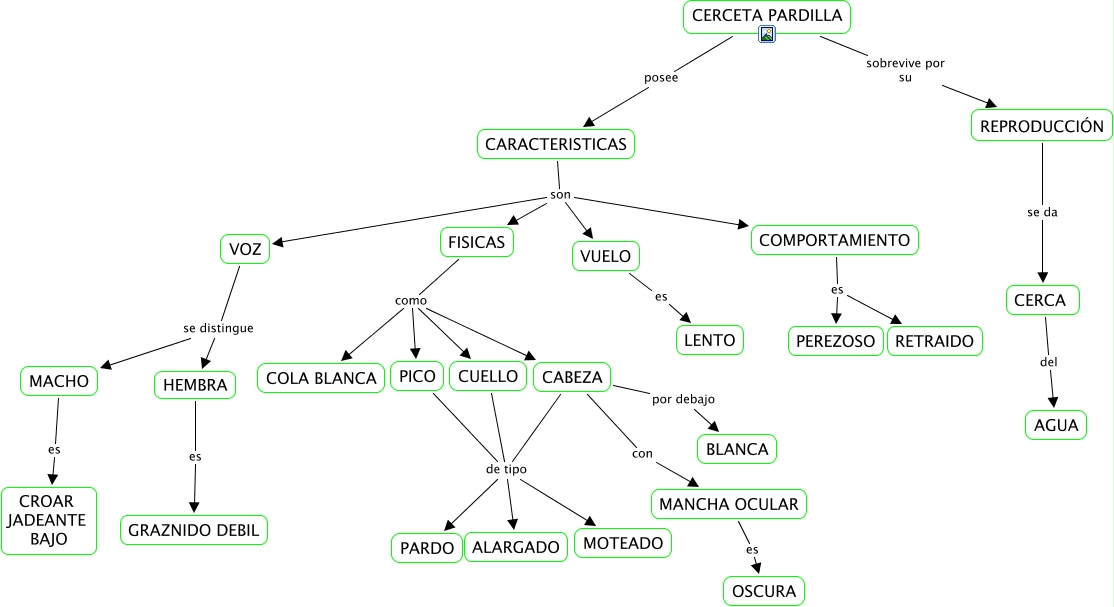 This Concept Map, created with IHMC CmapTools, has information related to: CERCETA PARDILLA, HEMBRA es GRAZNIDO DEBIL, CABEZA por debajo BLANCA, CERCA del AGUA, CARACTERISTICAS son FISICAS, FISICAS como PICO, PICO de tipo ALARGADO, CARACTERISTICAS son VOZ, CARACTERISTICAS son VUELO, FISICAS como CABEZA, CABEZA con MANCHA OCULAR, CUELLO de tipo ALARGADO, VUELO es LENTO, FISICAS como COLA BLANCA, CABEZA de tipo MOTEADO, CERCETA PARDILLA posee CARACTERISTICAS, MANCHA OCULAR es OSCURA, REPRODUCCIÓN se da CERCA, CABEZA de tipo PARDO, PICO de tipo PARDO, CUELLO de tipo PARDO