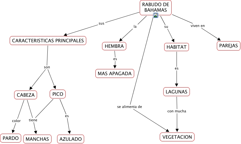 This Concept Map, created with IHMC CmapTools, has information related to: rabudo de bahamas, LAGUNAS con mucha VEGETACION, HABITAT es LAGUNAS, PICO tiene MANCHAS, RABUDO DE BAHAMAS su HABITAT, PICO es AZULADO, CARACTERISTICAS PRINCIPALES son PICO, CABEZA color PARDO, RABUDO DE BAHAMAS la HEMBRA, RABUDO DE BAHAMAS viven en PAREJAS, RABUDO DE BAHAMAS se alimenta de VEGETACION, CABEZA tiene MANCHAS, RABUDO DE BAHAMAS sus CARACTERISTICAS PRINCIPALES, HEMBRA es MAS APAGADA, CARACTERISTICAS PRINCIPALES son CABEZA