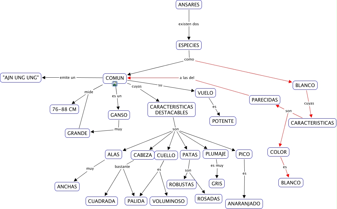 This Concept Map, created with IHMC CmapTools, has information related to: ANSARES, CARACTERISTICAS DESTACABLES son CABEZA, CARACTERISTICAS DESTACABLES son ALAS, COLOR es BLANCO, CABEZA bastante CUADRADA, CARACTERISTICAS DESTACABLES son PLUMAJE, COMUN su VUELO, CARACTERISTICAS son COLOR, GRANDE mide 76-88 CM, ANSARES existen dos ESPECIES, CARACTERISTICAS DESTACABLES son CUELLO, PATAS son ROSADAS, BLANCO cuyas CARACTERISTICAS, PLUMAJE es muy GRIS, COMUN es un GANSO, COMUN emite un "AJN UNG UNG", CUELLO es PALIDA, CABEZA bastante PALIDA, CARACTERISTICAS son PARECIDAS, ESPECIES como BLANCO, GANSO muy GRANDE