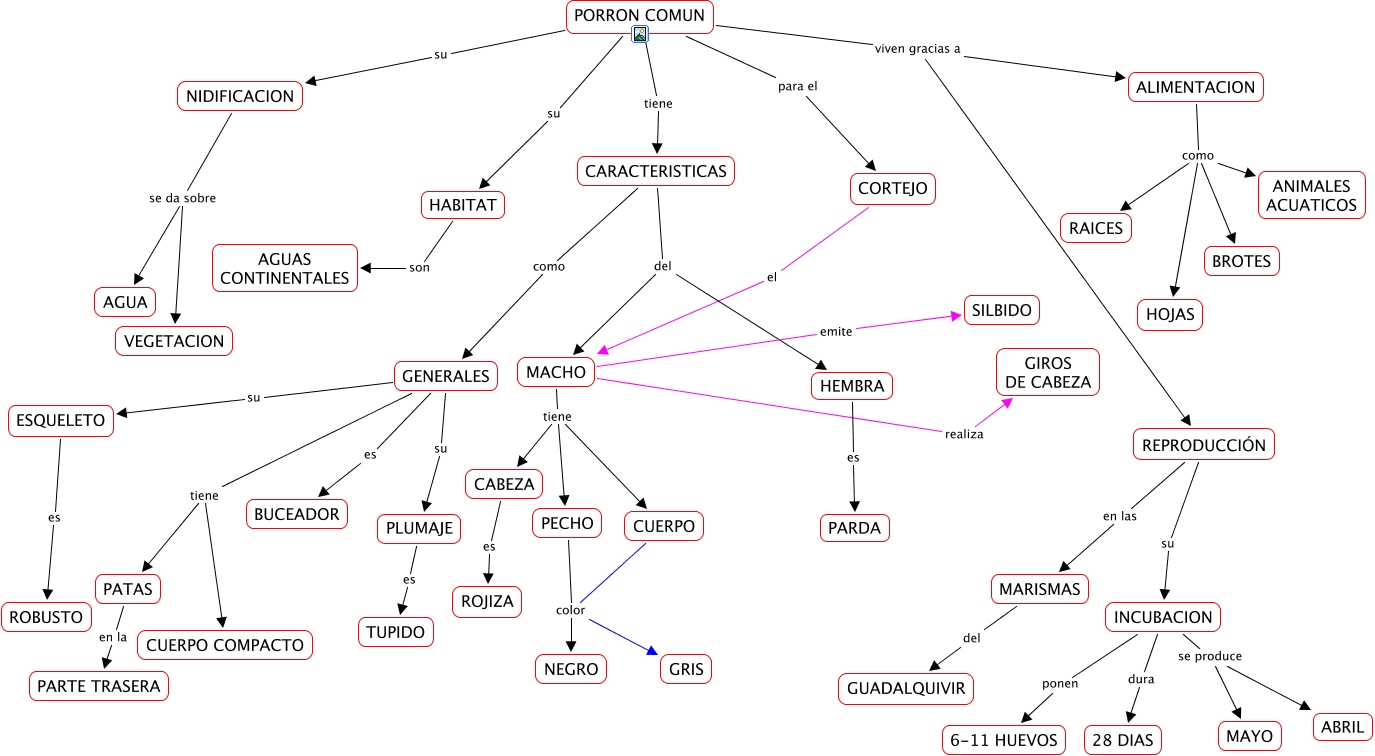 This Concept Map, created with IHMC CmapTools, has information related to: PORRON COMUN, PORRON COMUN viven gracias a REPRODUCCIÓN, REPRODUCCIÓN en las MARISMAS, NIDIFICACION se da sobre AGUA, INCUBACION se produce MAYO, PORRON COMUN su HABITAT, GENERALES tiene CUERPO COMPACTO, ALIMENTACION como ANIMALES ACUATICOS, INCUBACION dura 28 DIAS, CUERPO color GRIS, PLUMAJE es TUPIDO, GENERALES es BUCEADOR, PECHO color GRIS, GENERALES su ESQUELETO, PORRON COMUN viven gracias a ALIMENTACION, ESQUELETO es ROBUSTO, CARACTERISTICAS del HEMBRA, PORRON COMUN su NIDIFICACION, CUERPO color NEGRO, PECHO color NEGRO, ALIMENTACION como HOJAS