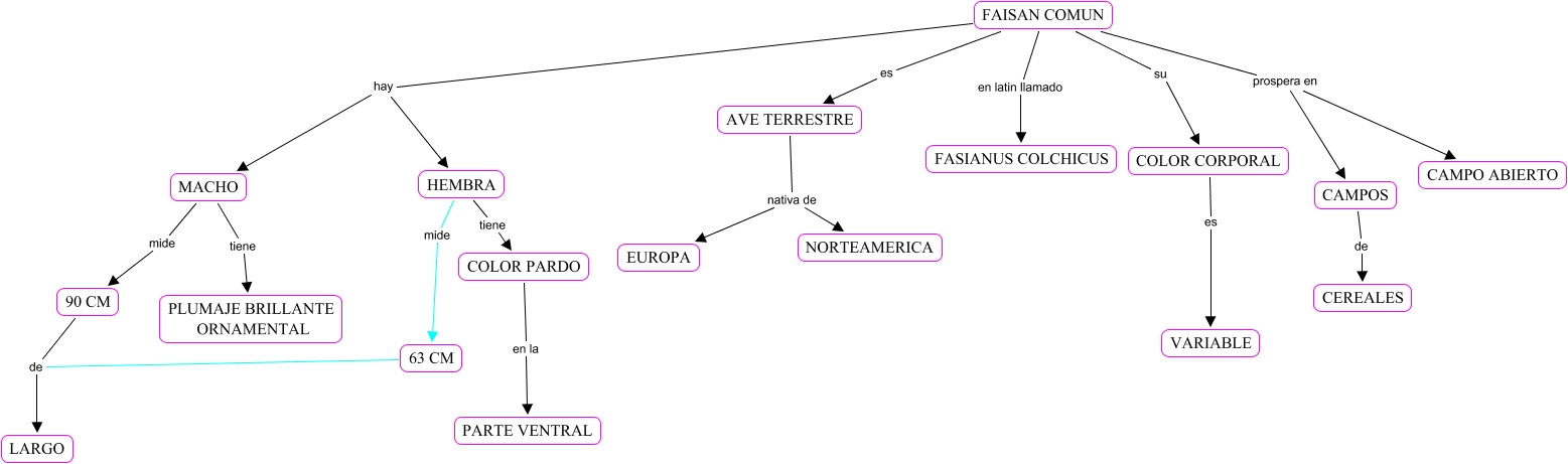 This Concept Map, created with IHMC CmapTools, has information related to: faisan comun, HEMBRA mide 63 CM, 63 CM de LARGO, HEMBRA tiene COLOR PARDO, CAMPOS de CEREALES, AVE TERRESTRE nativa de EUROPA, AVE TERRESTRE nativa de NORTEAMERICA, MACHO tiene PLUMAJE BRILLANTE ORNAMENTAL, FAISAN COMUN en latin llamado FASIANUS COLCHICUS, COLOR CORPORAL es VARIABLE, FAISAN COMUN hay MACHO, FAISAN COMUN es AVE TERRESTRE, FAISAN COMUN su COLOR CORPORAL, 90 CM de LARGO, COLOR PARDO en la PARTE VENTRAL, FAISAN COMUN hay HEMBRA, MACHO mide 90 CM, FAISAN COMUN prospera en CAMPOS, FAISAN COMUN prospera en CAMPO ABIERTO