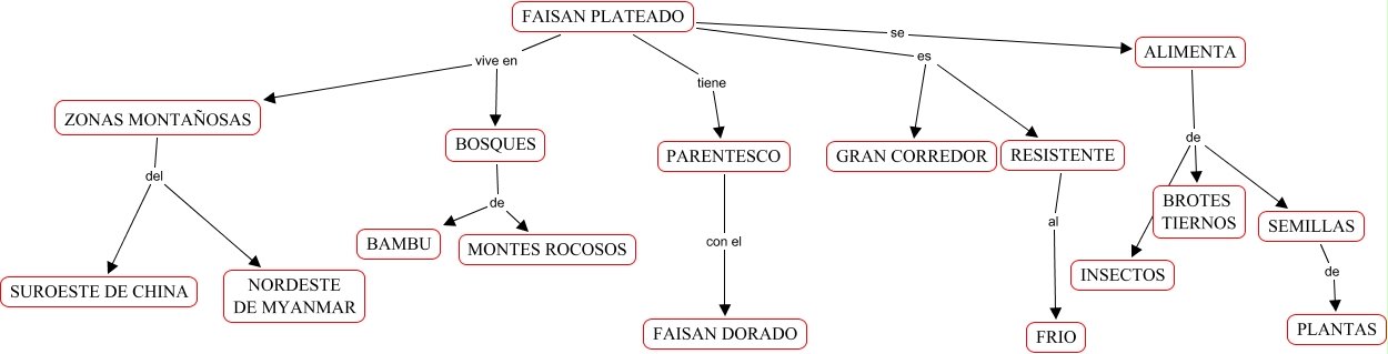 This Concept Map, created with IHMC CmapTools, has information related to: FAISAN PLATEADO, PARENTESCO con el FAISAN DORADO, FAISAN PLATEADO vive en ZONAS MONTAÑOSAS, FAISAN PLATEADO vive en BOSQUES, ALIMENTA de INSECTOS, FAISAN PLATEADO se ALIMENTA, FAISAN PLATEADO es GRAN CORREDOR, ZONAS MONTAÑOSAS del NORDESTE DE MYANMAR, ALIMENTA de SEMILLAS, ZONAS MONTAÑOSAS del SUROESTE DE CHINA, FAISAN PLATEADO es RESISTENTE, BOSQUES de MONTES ROCOSOS, FAISAN PLATEADO tiene PARENTESCO, ALIMENTA de BROTES TIERNOS, BOSQUES de BAMBU, RESISTENTE al FRIO, SEMILLAS de PLANTAS