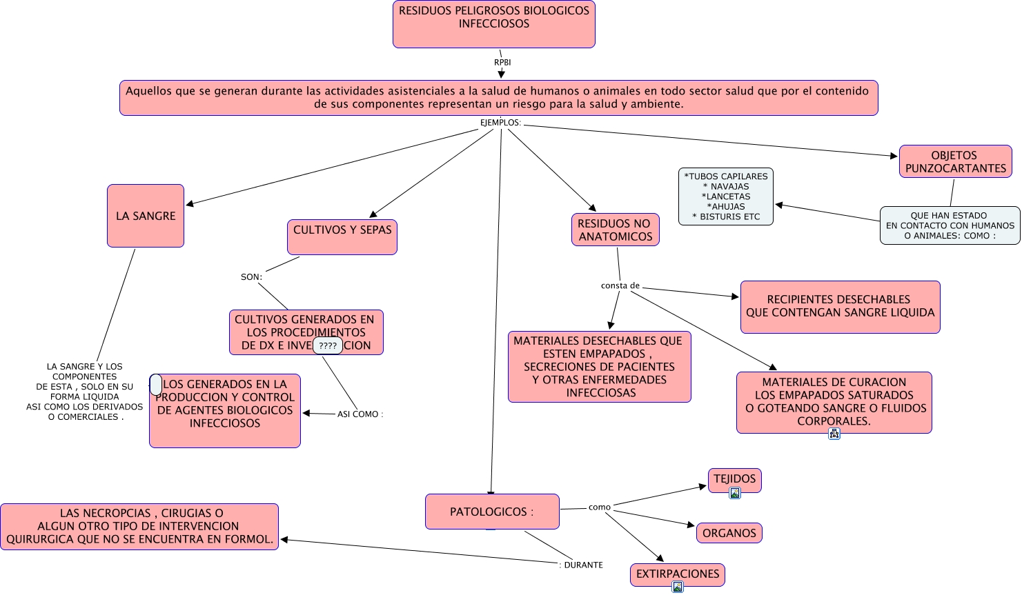 This Concept Map, created with IHMC CmapTools, has information related to: MAPA_GENERAL, RESIDUOS NO ANATOMICOS consta de MATERIALES DE CURACION LOS EMPAPADOS SATURADOS O GOTEANDO SANGRE O FLUIDOS CORPORALES., CULTIVOS Y SEPAS SON: ????, PATOLOGICOS : como ORGANOS, RESIDUOS PELIGROSOS BIOLOGICOS INFECCIOSOS RPBI Aquellos que se generan durante las actividades asistenciales a la salud de humanos o animales en todo sector salud que por el contenido de sus componentes representan un riesgo para la salud y ambiente., CULTIVOS GENERADOS EN LOS PROCEDIMIENTOS DE DX E INVESTIGACION ASI COMO : LOS GENERADOS EN LA PRODUCCION Y CONTROL DE AGENTES BIOLOGICOS INFECCIOSOS, PATOLOGICOS : como EXTIRPACIONES, Aquellos que se generan durante las actividades asistenciales a la salud de humanos o animales en todo sector salud que por el contenido de sus componentes representan un riesgo para la salud y ambiente. EJEMPLOS: RESIDUOS NO ANATOMICOS, RESIDUOS NO ANATOMICOS consta de MATERIALES DESECHABLES QUE ESTEN EMPAPADOS , SECRECIONES DE PACIENTES Y OTRAS ENFERMEDADES INFECCIOSAS, LA SANGRE LA SANGRE Y LOS COMPONENTES DE ESTA , SOLO EN SU FORMA LIQUIDA ASI COMO LOS DERIVADOS O COMERCIALES ., RESIDUOS NO ANATOMICOS consta de RECIPIENTES DESECHABLES QUE CONTENGAN SANGRE LIQUIDA, Aquellos que se generan durante las actividades asistenciales a la salud de humanos o animales en todo sector salud que por el contenido de sus componentes representan un riesgo para la salud y ambiente. EJEMPLOS: PATOLOGICOS, PATOLOGICOS : como TEJIDOS, Aquellos que se generan durante las actividades asistenciales a la salud de humanos o animales en todo sector salud que por el contenido de sus componentes representan un riesgo para la salud y ambiente. EJEMPLOS: LA SANGRE, Aquellos que se generan durante las actividades asistenciales a la salud de humanos o animales en todo sector salud que por el contenido de sus componentes representan un riesgo para la salud y ambiente. EJEMPLOS: OBJETOS PUNZOCARTANTES, OBJETOS PUNZOCARTANTES *TUBOS CAPILARES * NAVAJAS *LANCETAS *AHUJAS * BISTURIS ETC, Aquellos que se generan durante las actividades asistenciales a la salud de humanos o animales en todo sector salud que por el contenido de sus componentes representan un riesgo para la salud y ambiente. EJEMPLOS: CULTIVOS Y SEPAS, PATOLOGICOS : : DURANTE LAS NECROPCIAS , CIRUGIAS O ALGUN OTRO TIPO DE INTERVENCION QUIRURGICA QUE NO SE ENCUENTRA EN FORMOL.