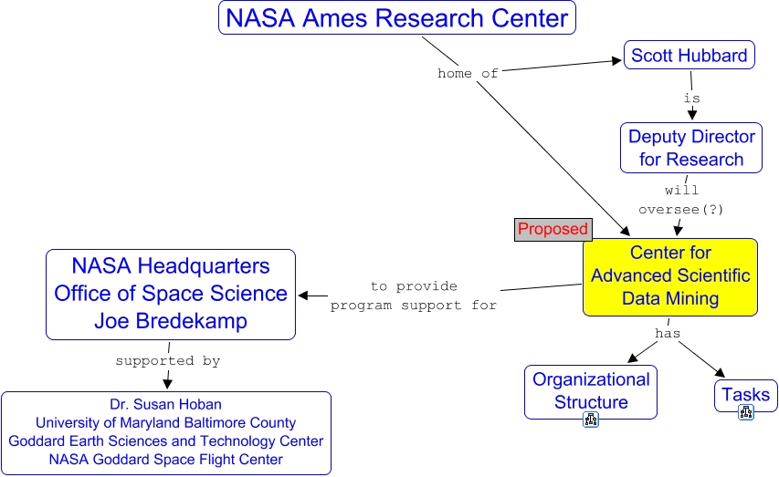 This Concept Map, created with IHMC CmapTools, has information related to: Center, Center for Advanced Scientific Data Mining to provide program support for NASA Headquarters Office of Space Science Joe Bredekamp, NASA Headquarters Office of Space Science Joe Bredekamp supported by Dr. Susan Hoban University of Maryland Baltimore County Goddard Earth Sciences and Technology Center NASA Goddard Space Flight Center, Center for Advanced Scientific Data Mining has Tasks, NASA Ames Research Center home of Scott Hubbard, Scott Hubbard is Deputy Director for Research, Center for Advanced Scientific Data Mining has Organizational Structure, NASA Ames Research Center home of Center for Advanced Scientific Data Mining, Deputy Director for Research will oversee(?) Center for Advanced Scientific Data Mining