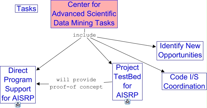 This Concept Map, created with IHMC CmapTools, has information related to: Tasks, Center for Advanced Scientific Data Mining Tasks include Identify New Opportunities, Center for Advanced Scientific Data Mining Tasks include Project TestBed for AISRP, Center for Advanced Scientific Data Mining Tasks include Code I/S Coordination, Project TestBed for AISRP will provide proof-of concept Direct Program Support for AISRP, Center for Advanced Scientific Data Mining Tasks include Direct Program Support for AISRP