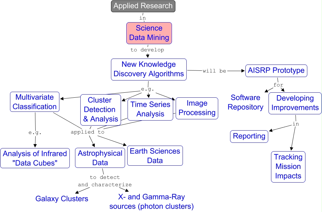 This Concept Map, created with IHMC CmapTools, has information related to: Research, Cluster Detection & Analysis applied to Astrophysical Data, New Knowledge Discovery Algorithms e.g. Cluster Detection & Analysis, Astrophysical Data to detect and characterize X- and Gamma-Ray sources (photon clusters), Developing Improvements in Reporting, Multivariate Classification applied to Astrophysical Data, New Knowledge Discovery Algorithms will be AISRP Prototype, Image Processing applied to Earth Sciences Data, New Knowledge Discovery Algorithms e.g. Multivariate Classification, Time Series Analysis applied to Earth Sciences Data, AISRP Prototype for Software Repository, Time Series Analysis applied to Astrophysical Data, Developing Improvements in Tracking Mission Impacts, AISRP Prototype for Developing Improvements, Multivariate Classification e.g. Analysis of Infrared "Data Cubes", Science Data Mining to develop New Knowledge Discovery Algorithms, New Knowledge Discovery Algorithms e.g. Time Series Analysis, Image Processing applied to Astrophysical Data, Applied Research in Science Data Mining, Astrophysical Data to detect and characterize Galaxy Clusters, New Knowledge Discovery Algorithms e.g. Image Processing
