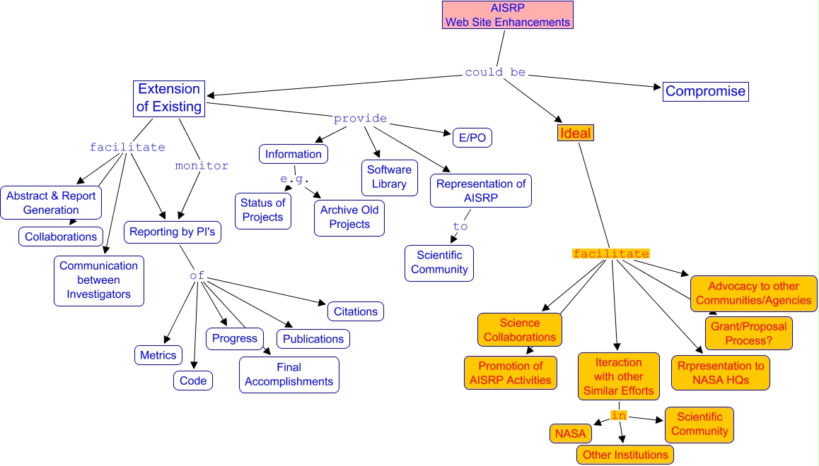 This Concept Map, created with IHMC CmapTools, has information related to: WWW, Extension of Existing provide Software Library, Extension of Existing facilitate Collaborations, Iteraction with other Similar Efforts in NASA, Extension of Existing provide E/PO, Representation of AISRP to Scientific Community, AISRP Web Site Enhancements could be Extension of Existing, Extension of Existing facilitate Communication between Investigators, AISRP Web Site Enhancements could be Compromise, Extension of Existing provide Representation of AISRP, Iteraction with other Similar Efforts in Scientific Community, Reporting by PI's of Publications, Information e.g. Archive Old Projects, Ideal facilitate Grant/Proposal Process?, Reporting by PI's of Final Accomplishments, Ideal facilitate Science Collaborations, Ideal facilitate Iteraction with other Similar Efforts, Reporting by PI's of Metrics, Reporting by PI's of Progress, Ideal facilitate Advocacy to other Communities/Agencies, Reporting by PI's of Citations